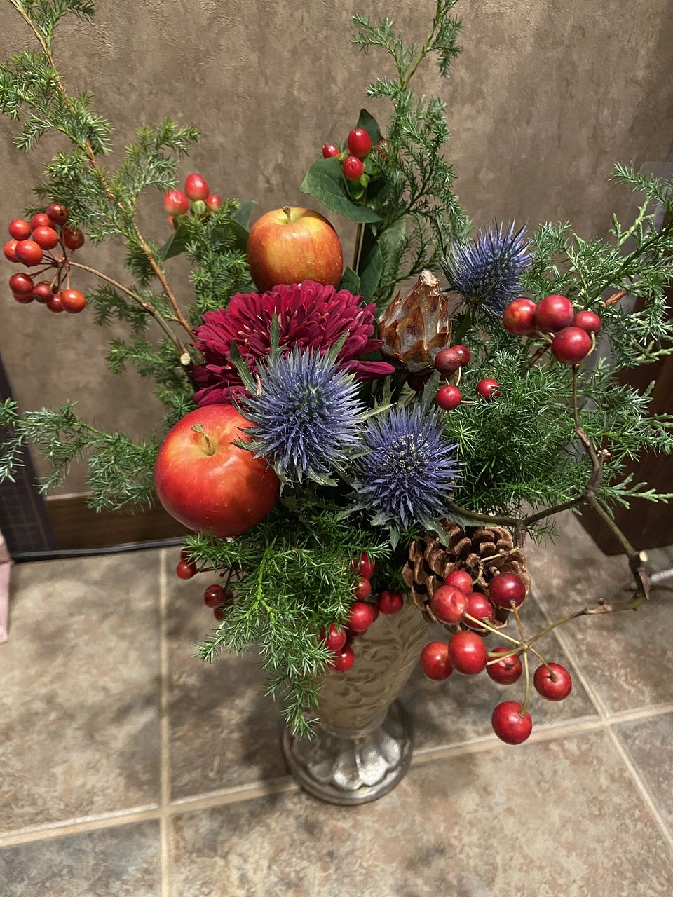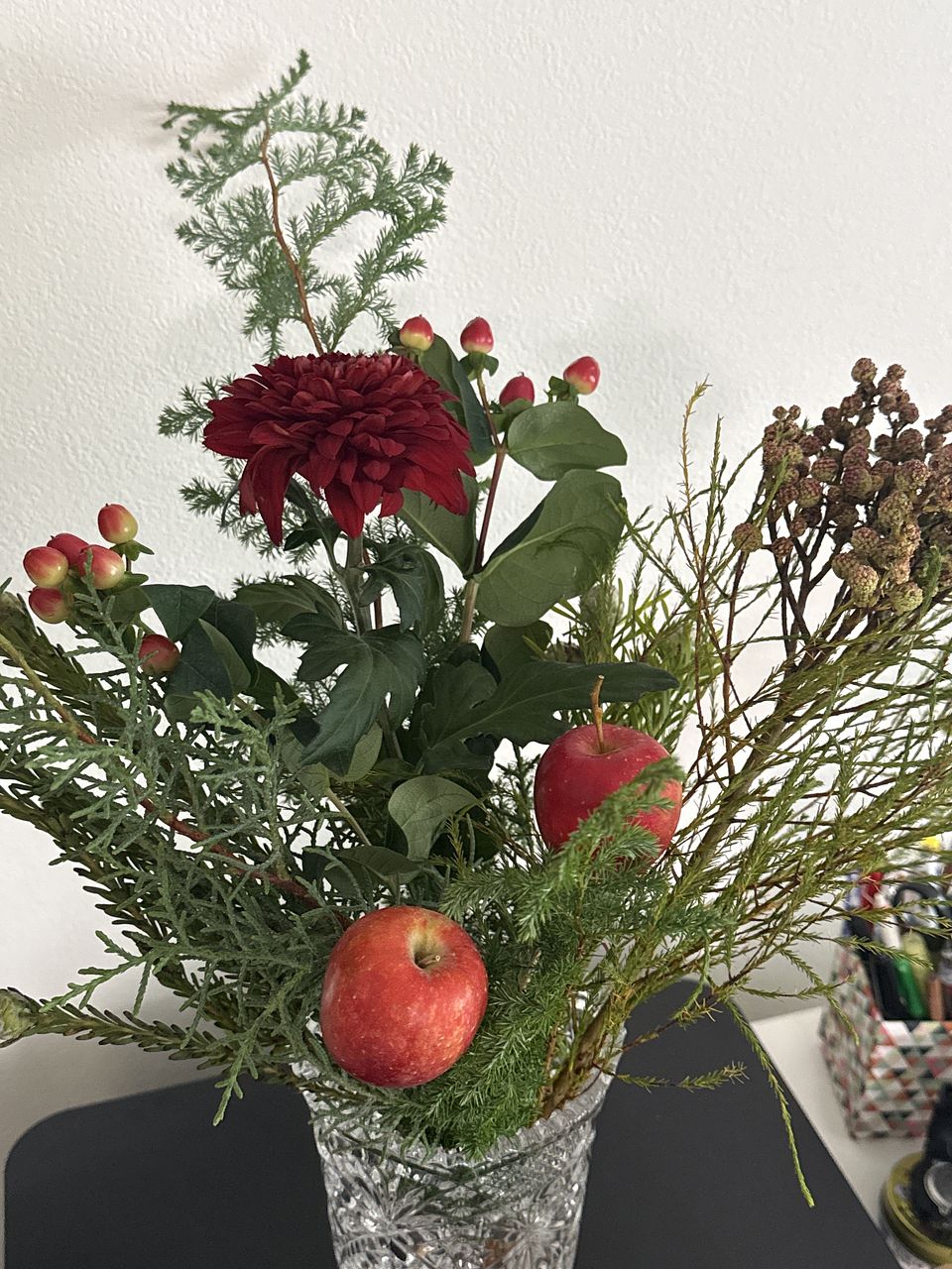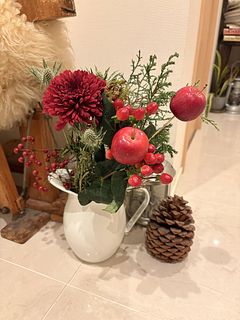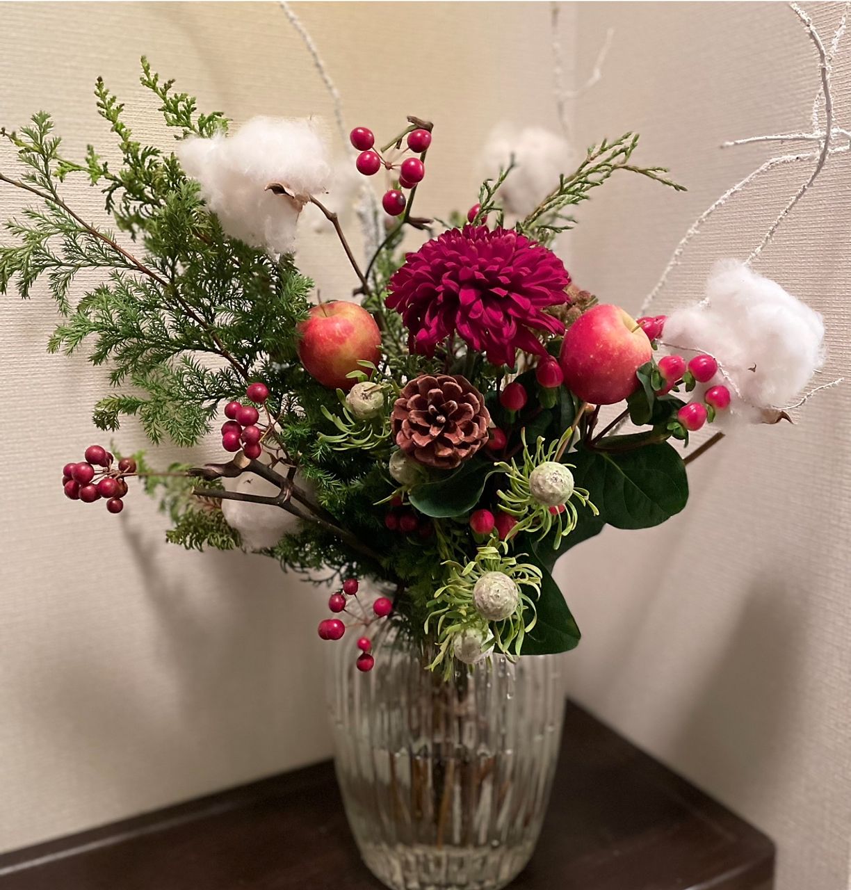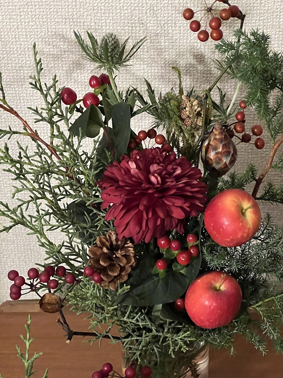 届いて箱を開けた瞬間、とても良い香りで、まるで森の中にいったようでした。 赤いりんごと赤い木の実が、なんとも可愛らしくて、一気にクリスマス気分になりました。 いつも素敵なお花を届けてくれてありがとうございます。今度は何を頼もうか今から楽しみです。