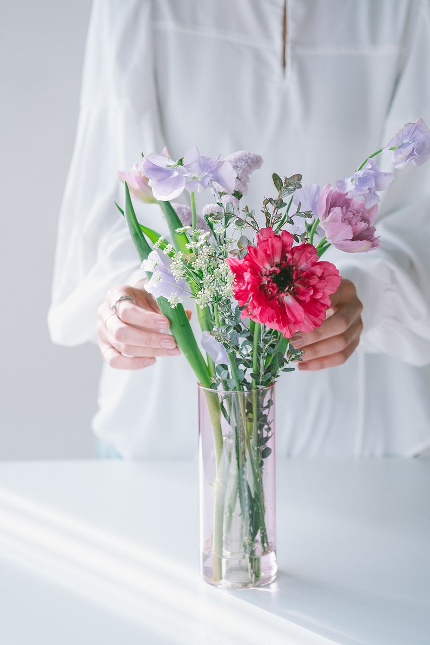 ピンク色の筒には5〜10本程度のお花を飾ることができます。ドーナツ状になっていることでお花が支えられ、バランスよく活けやすいのも嬉しいところ。