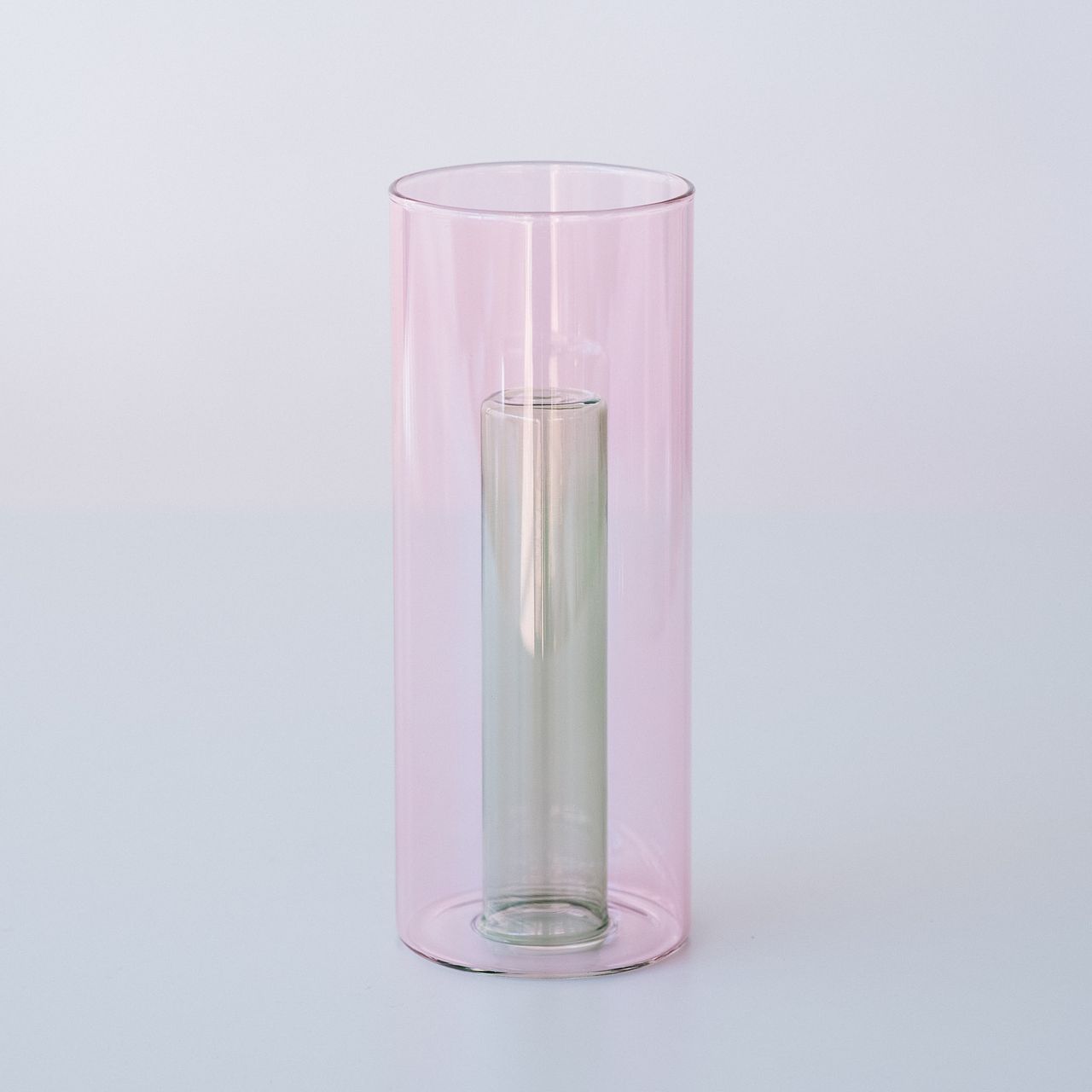 透明なピンクとグリーンのコンビネーションが美しいリバーシブルベース。この不思議な形、かわいいだけではないんです!その名の通り、表裏両方を使ってお花を飾ることができるんです。