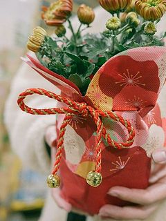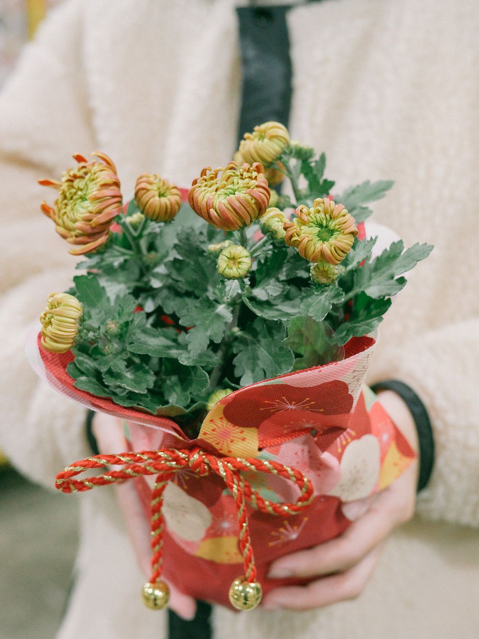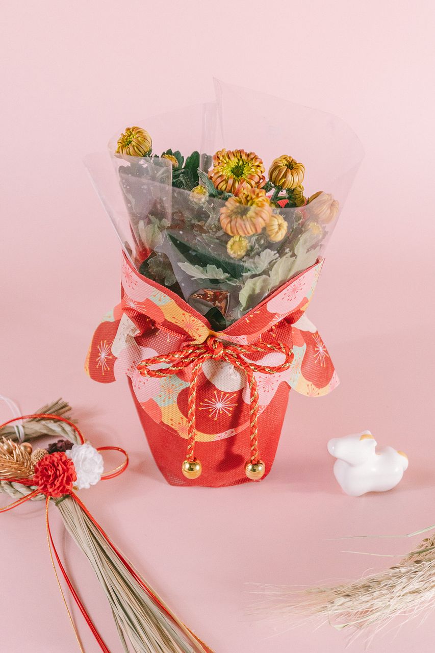 巾着仕立てのマムをそっとお部屋に飾るだけで、空間が一気に華やぎ、季節感あふれる迎春インテリアに🎍