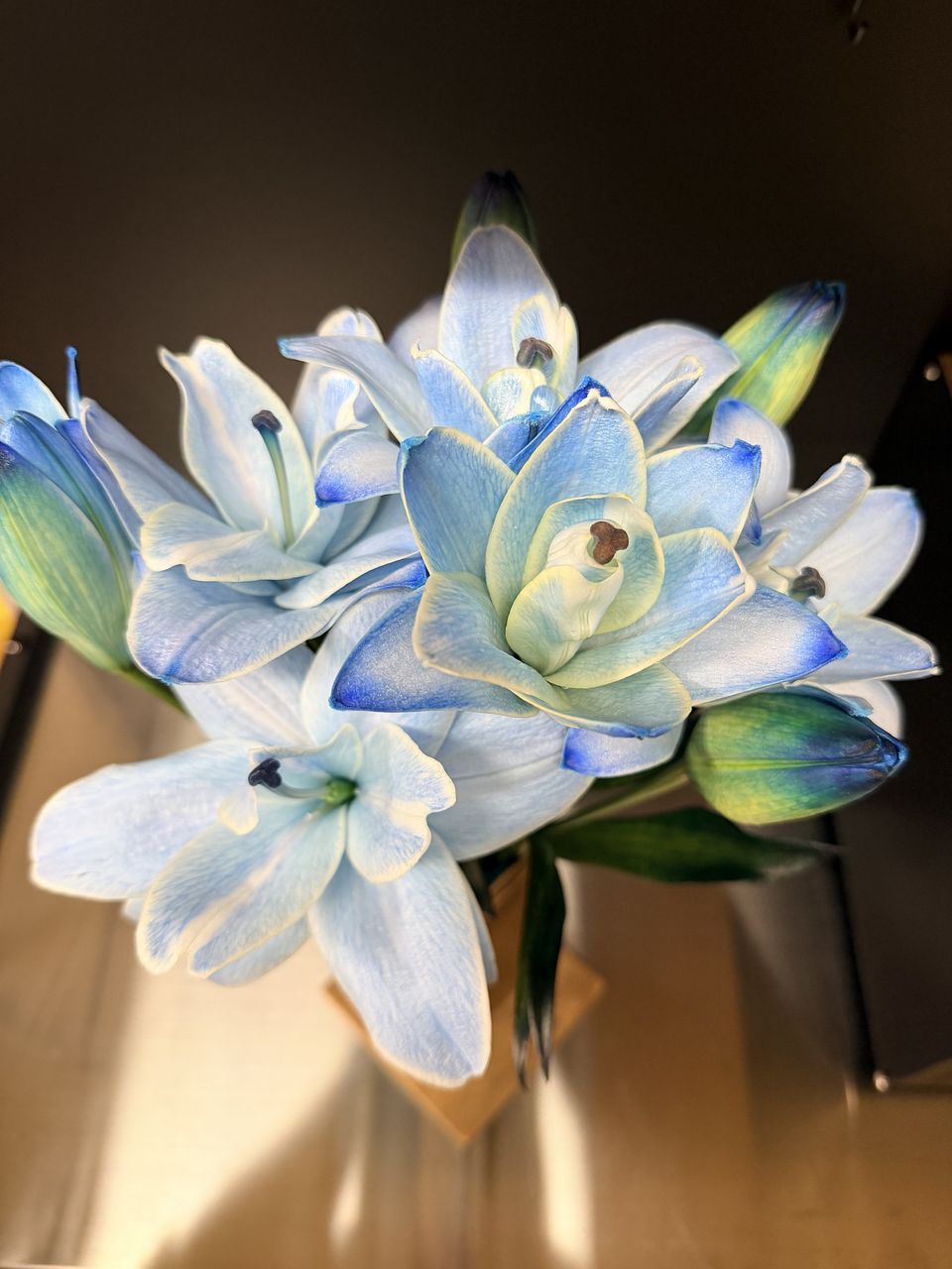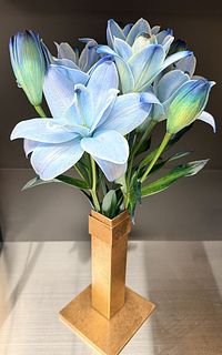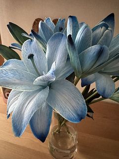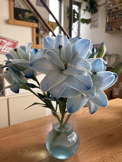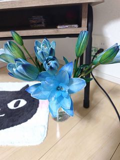 息子の誕生祝いに初めての購入しました。珍しいブルー🩵リリーだったので、到着までドキドキでした。どんなふうに梱包してあるのか、そーっと開封したら、丁寧にペーパーに包まれていました。お水に浸かってないお花を宅配で注文したことがなかったので、不安でしたが、蕾も一枝に四つあり、しっかりずっしりの重み、葉っぱや茎も青い染料で薄ら染まっていて、透明な花瓶に綺麗なブルーのお水が映えました。これから、少しずつ開いてくれるのが楽しみです。