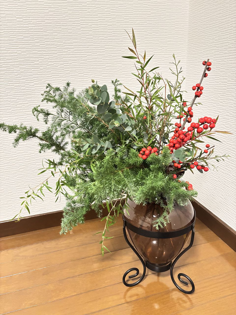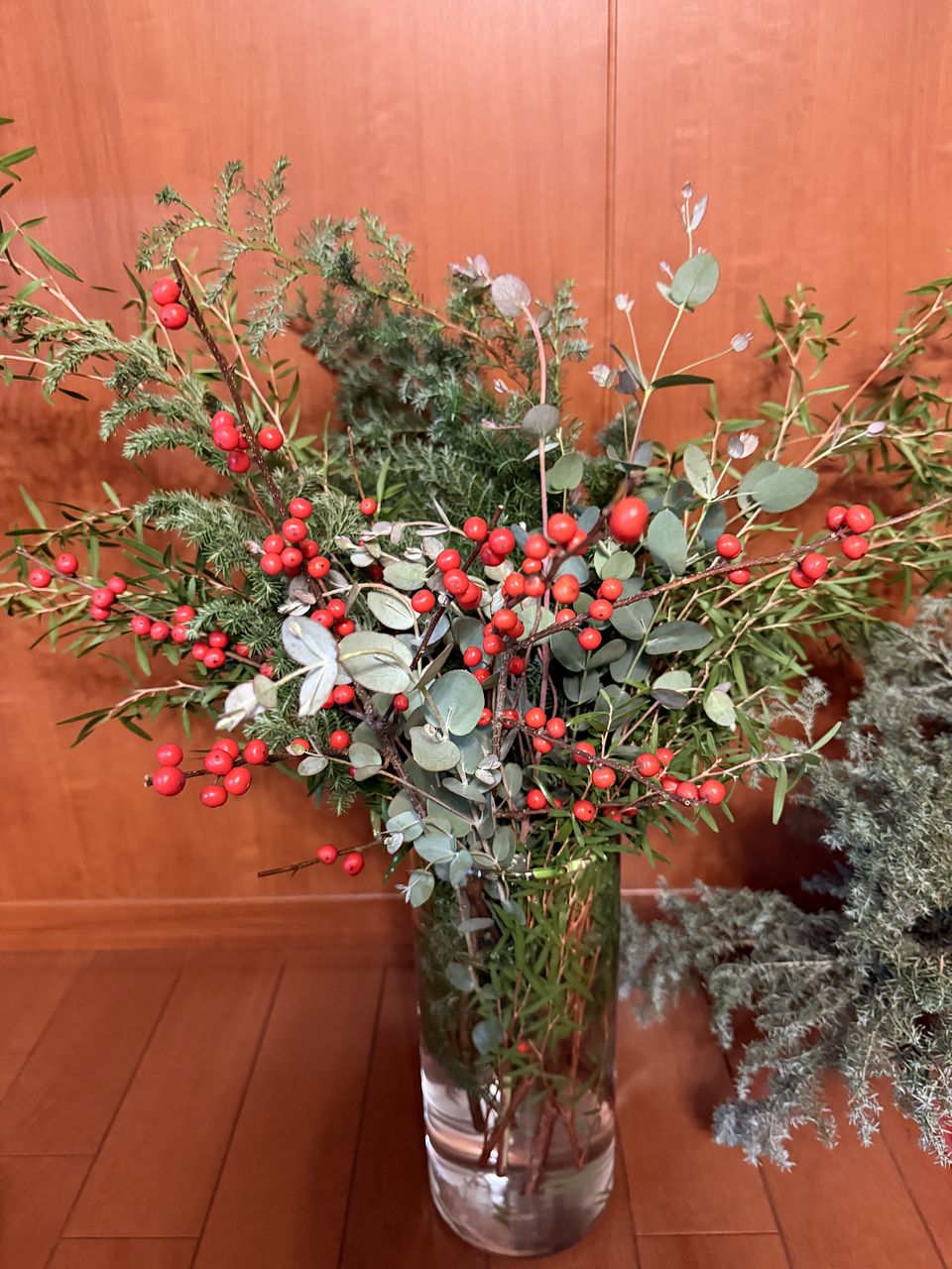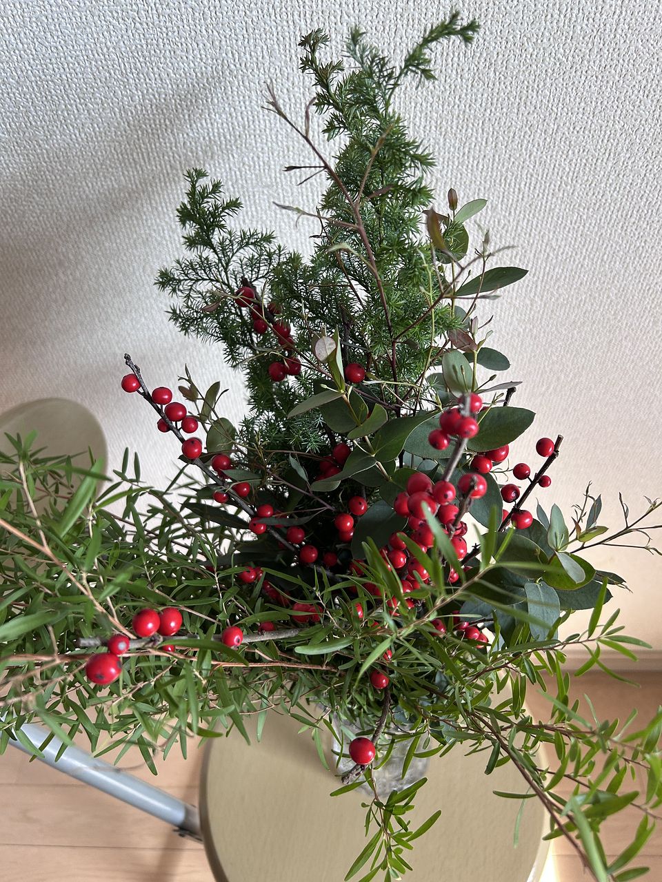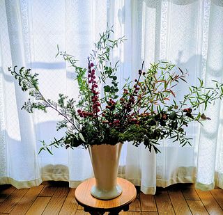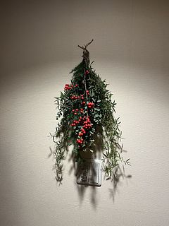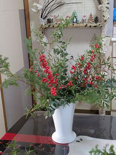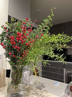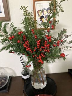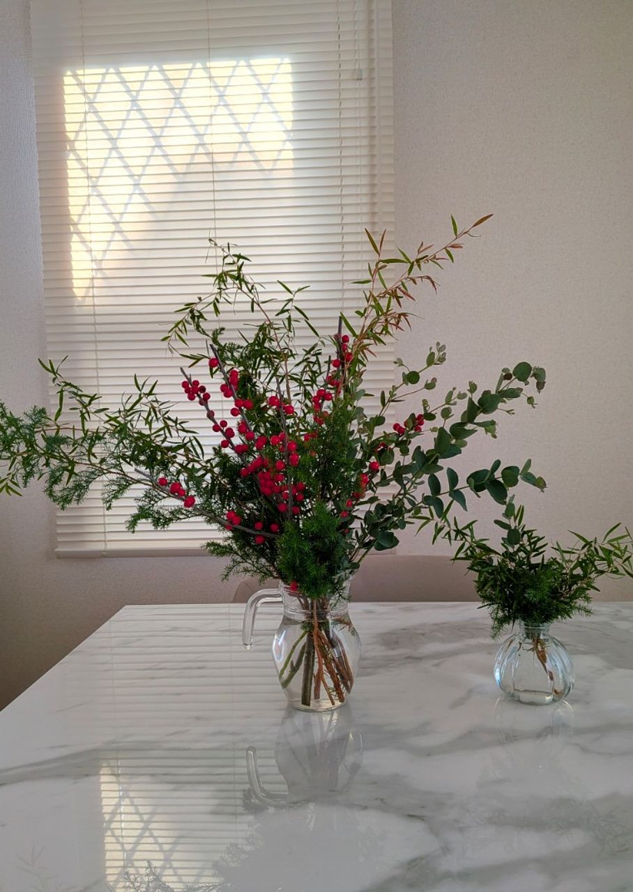 ボリュームあったので、花瓶二つに生けて、小さ目のスワッグも作りました。クリスマス終わったので少し花材を足して、早速お正月仕様に変更しました。2度楽しめるので満足感あります。来年も買いたいなぁ。