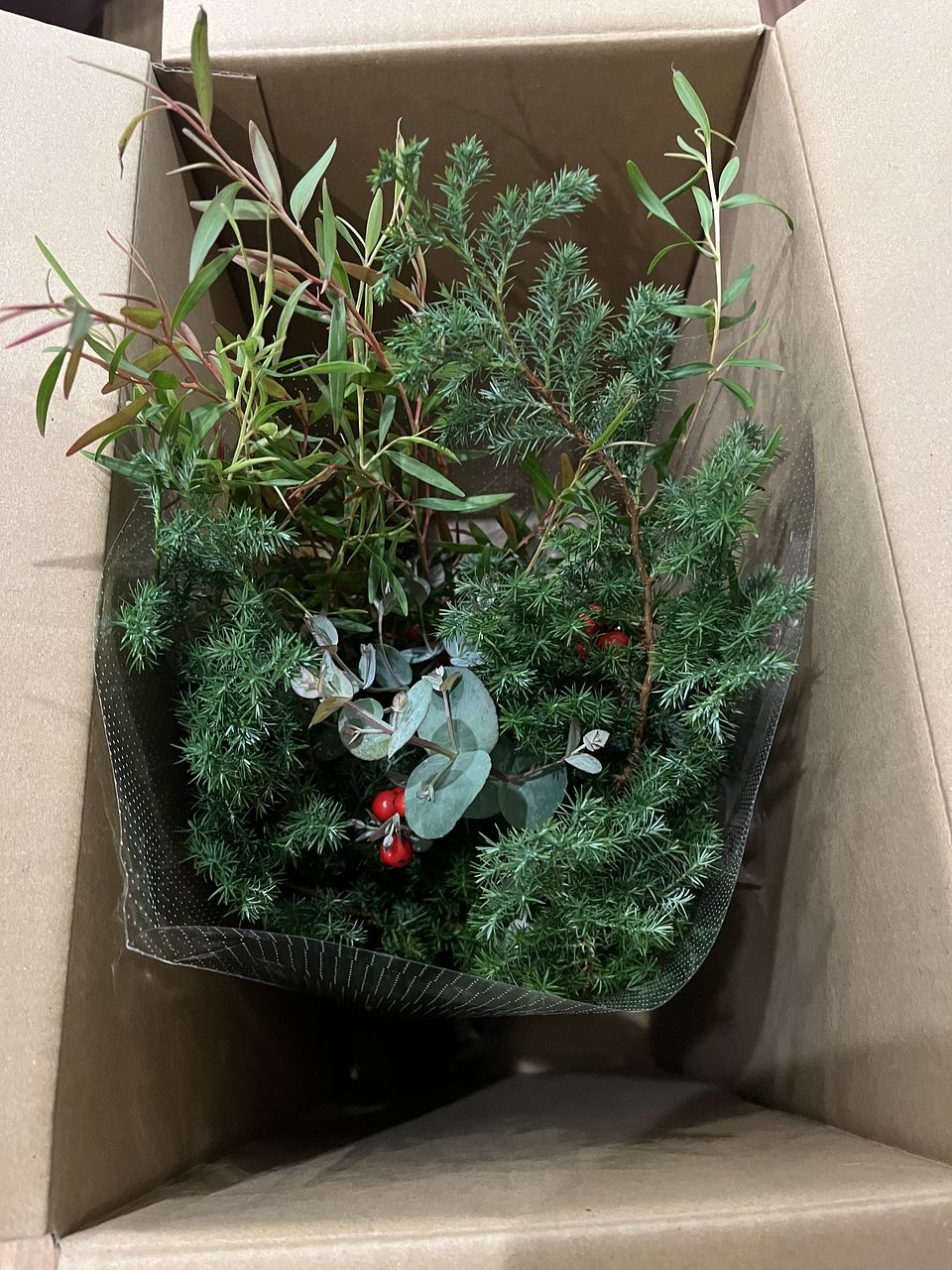 箱を開けた瞬間に良い香りがしました。 スワッグにして外に飾りましたが、レモンティーツリーが風にそよいで爽やかな感じです。 この金額で数種類のグリーンが入っていて満足です。