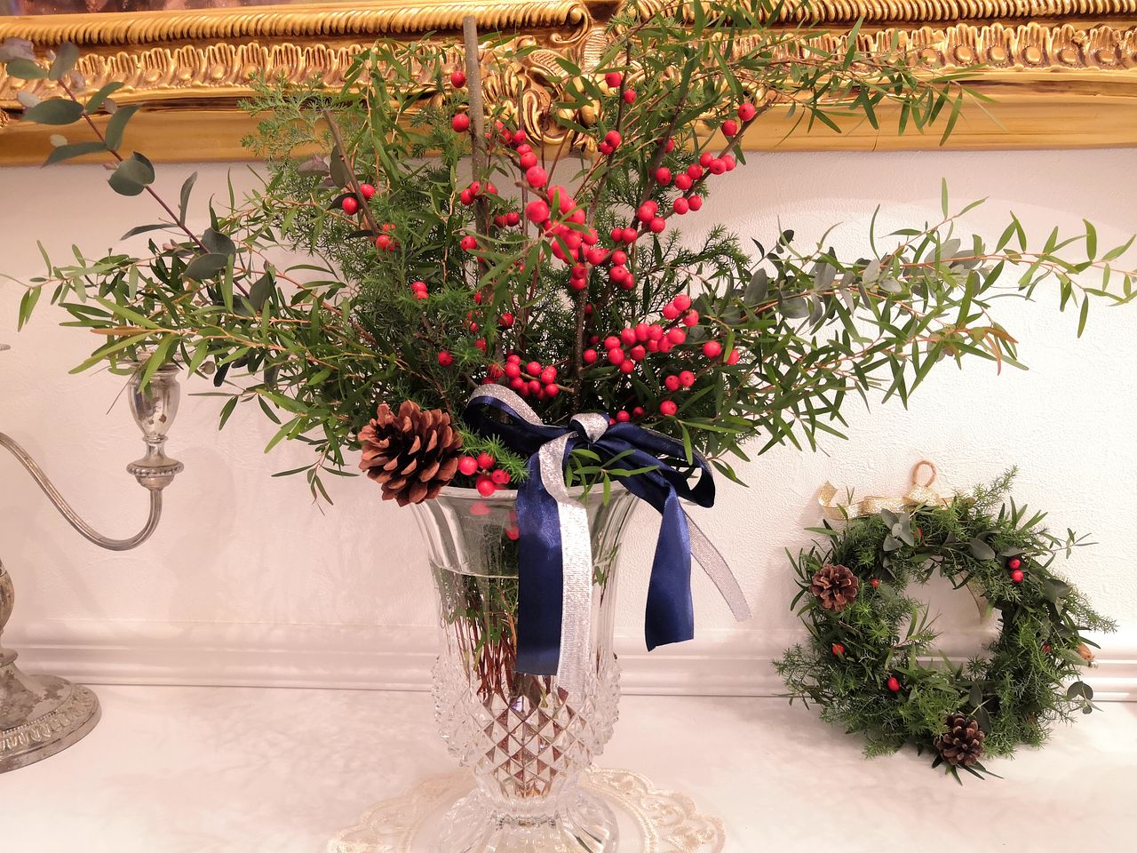 ボリュームたっぷりだったので2つに分けて飾りました♪ウィンターベリーがアクセントになってクリスマスにぴったりで見るたびにニヤニヤしてしまいます。