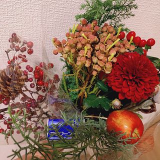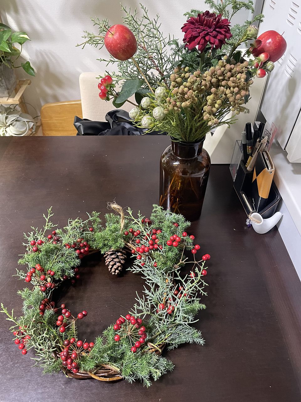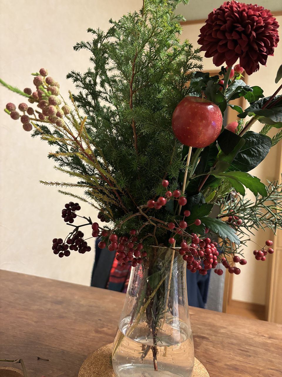 お花屋さんでりんごを花材として使ったアレンジは今まで見たことがなく、「りんごってこんなふうに飾れるんだ」と感心しました。