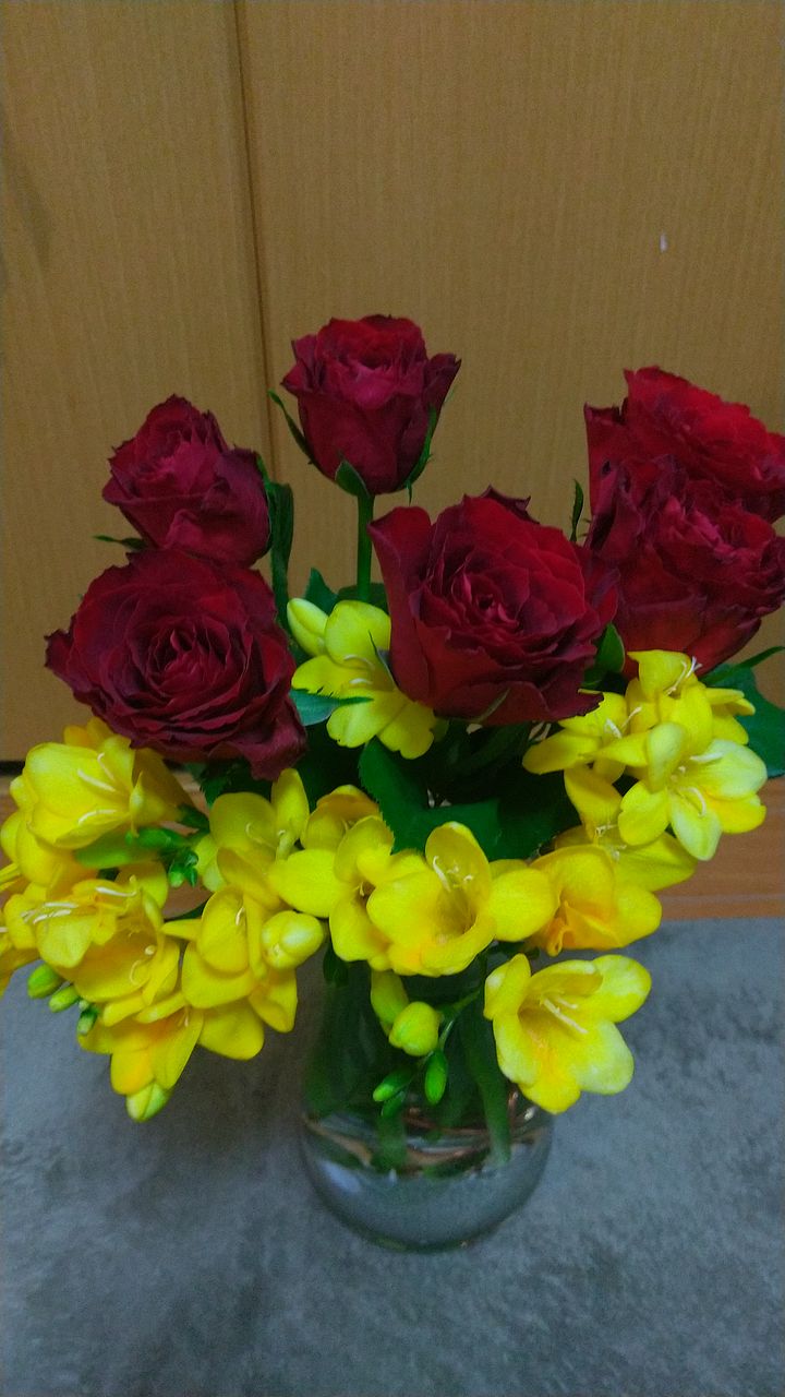 前回はかわいい系のローズを購入したので、今回はクリスマスカラーの赤で大人っぽい空間を作りたくて購入しました。お花は6本あり問題はなかったのですが、バラの葉が到着時かなり元気がなくカラカラになっており、水揚げを2時間しましたが葉はあまり元気がなかったのでかなり外しました。ボリュームが減ってしまったので、グリーンか枝物を追加しようかと考えています。赤い薔薇を購入したのは初めてですが、深い赤が素敵だと思います。花瓶も一緒に購入しました。箱から出した時には大きい!と思いましたが、とても安定感があるので使いやすいと思います。