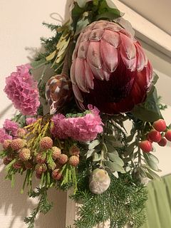 プロテアを主役に針葉樹やユーカリ、実もの、ネイティブフラワーをたっぷり束ねて。