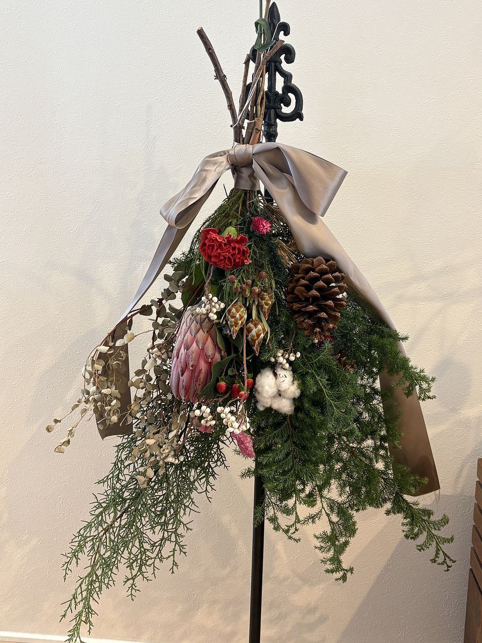 針葉樹やプロテアなど日持ちのする森のノエルスワッグをお願いしました。 クリスマスらしいカラーリングでしばらく楽しませていただきます。