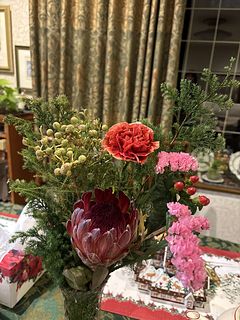 箱を開けたら赤やピンクの花々で可愛い❤️が第一印象。 プロテアは落ち着いた赤で、バーゼリア・ストロベリーのつぶつぶとヒペリカムの真っ赤でクリスマスを感じます🎄 ボリュームもあってお部屋も気分も明るくなりました🎵 プロテアがもう少し開いたらスワッグにして また楽しみたいと思います🎶 あのお値段で この花束、とってもお得だと思います🤩 ありがとうございました!