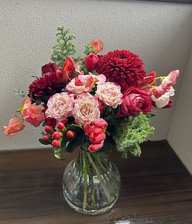 スパイラルに組まれていて葉の処理もしてあるのでそのまま飾って楽しめます。たっぷり入っているので華やかです。内容は毎回おまかせですが、色の雰囲気は同じ雰囲気でお届け予定です。お楽しみに!