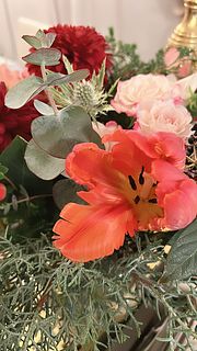 溢れる様なお花で、ボリュームたっぷり。存在感のあるマムや珍しい色のカーネーションとスイトピー。大変好評でした。 チューリップ🌷は、もう入らないので、別枠で飾りました。