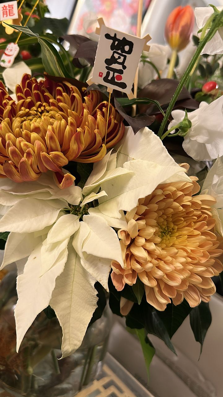 前回はクリスマス🎄っぽく、 今回はお正月🎍をイメージして作成して下さり 感激です。花瓶に対してのボリュームが少なかったので自宅にあるお花とアレンジして飾りました。 2026年🐎に向けて走り出しました🐎