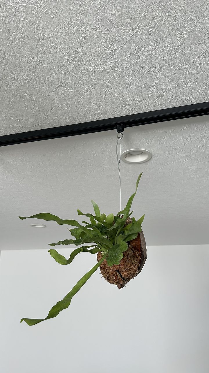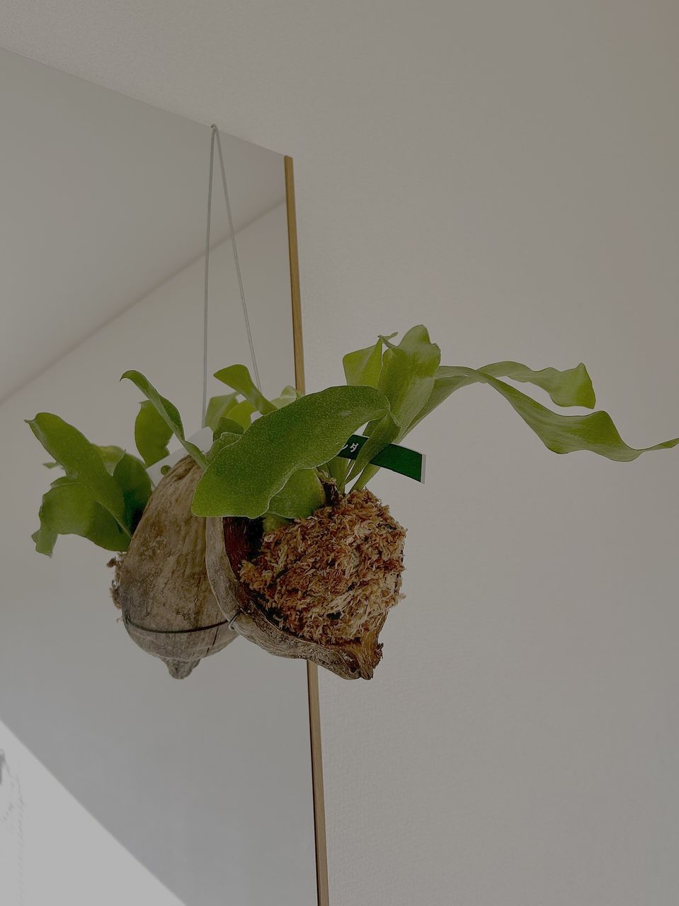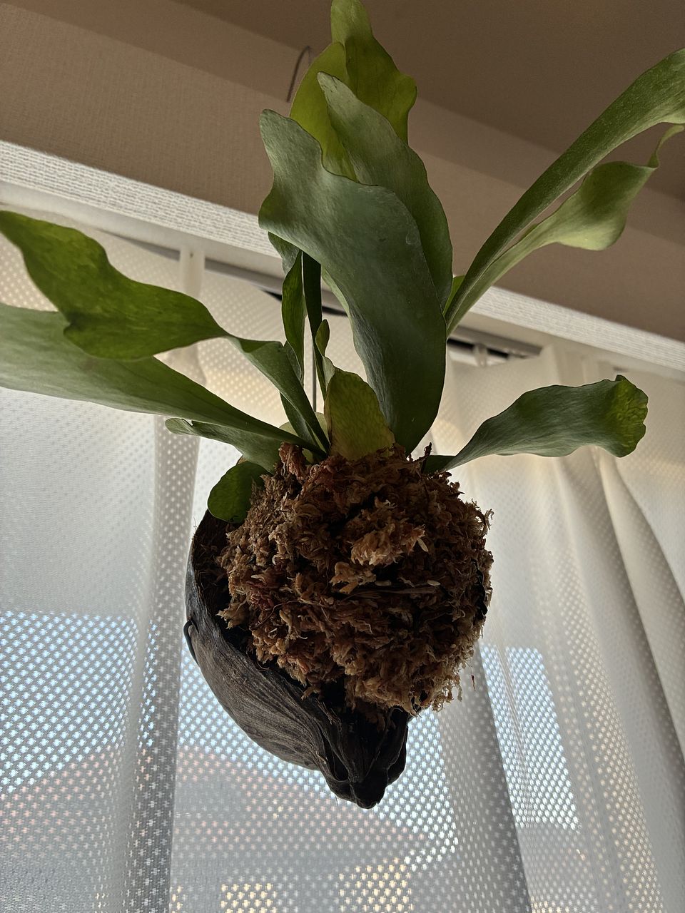 ずっと気になっていたビカクシダ、ヤシの実仕立てが気になって、ついにポチッと。元気で可愛いコが届きました! 水苔初めてで勝手がわからずまごつくも、商品ページの説明をガイドに、どぷんのヤシの実の台ごと腰水につけて余分な水がはけたら、いざハンギング。少しぱらっとしたものの、テグス固定はしなくて大丈夫でした。 これ、やっぱり可愛い! 冬に向かう季節なので、乾燥&寒さ対策しつつ、可愛がります。