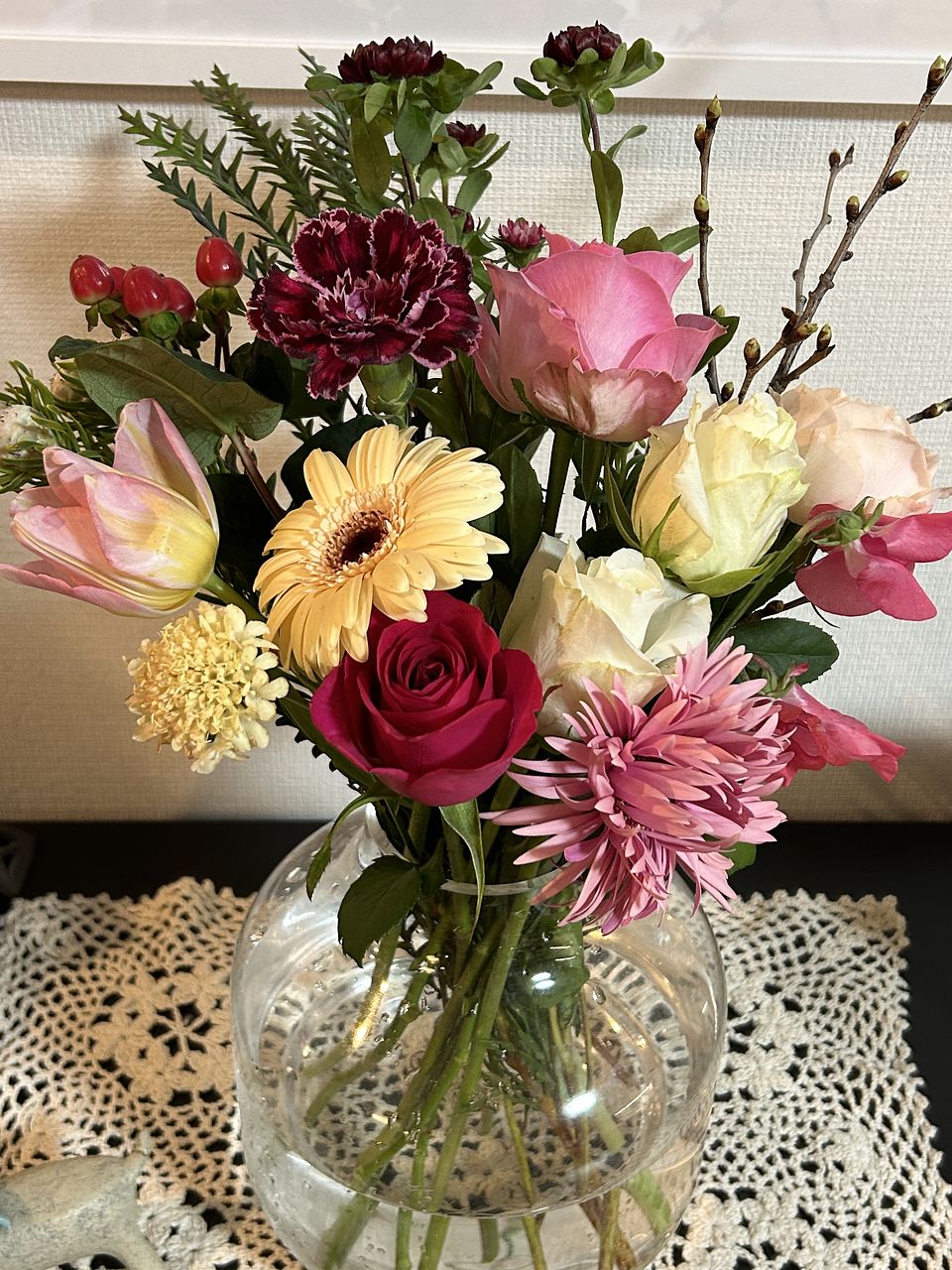 年末なのでいつもより奮発しましたが大正解! 色とりどりのお花だけでなく、実物、枝物も豊富で一気に部屋が華やかになり、楽しい気分で過ごせそうです💌