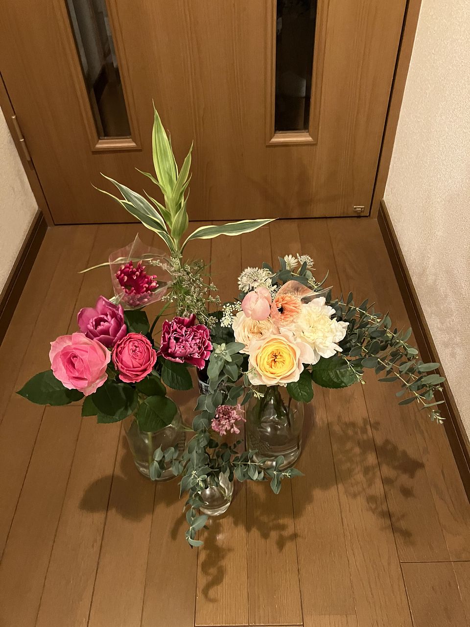 大きな花瓶にまとめて飾りました! 思った通りのボリュームでみんなかわいいです。 flowerのお花たちはしっかり水揚げをしてあげると、とても長く咲いていてくれるので楽しみです。