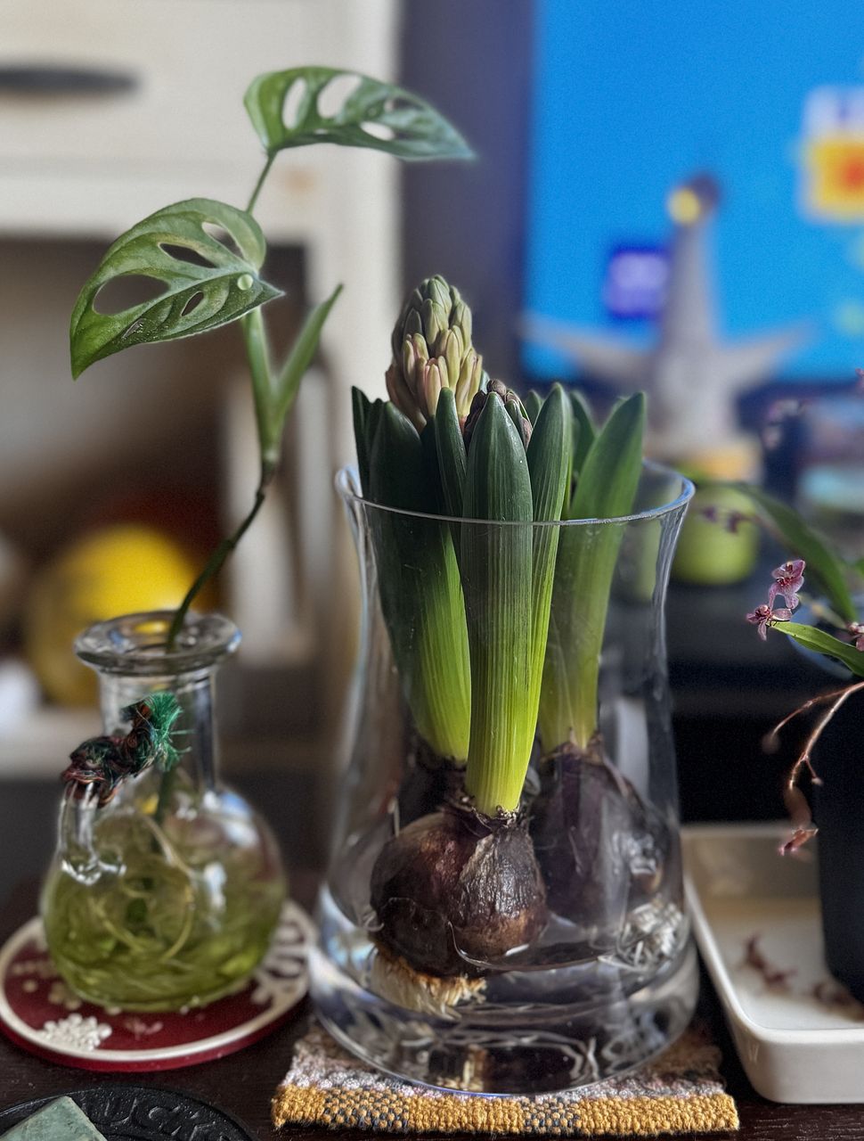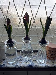 根が思ったよりも短く、下ではなく横に出ているものが多く、ガラス瓶を選ぶのが大変でした。前から家で育てていたヒヤシンスの花と比べると分かりやすいかと思います。これからの成長を楽しみにしています。花が咲くと、とてもいい香りがする🪻大好きな花です。