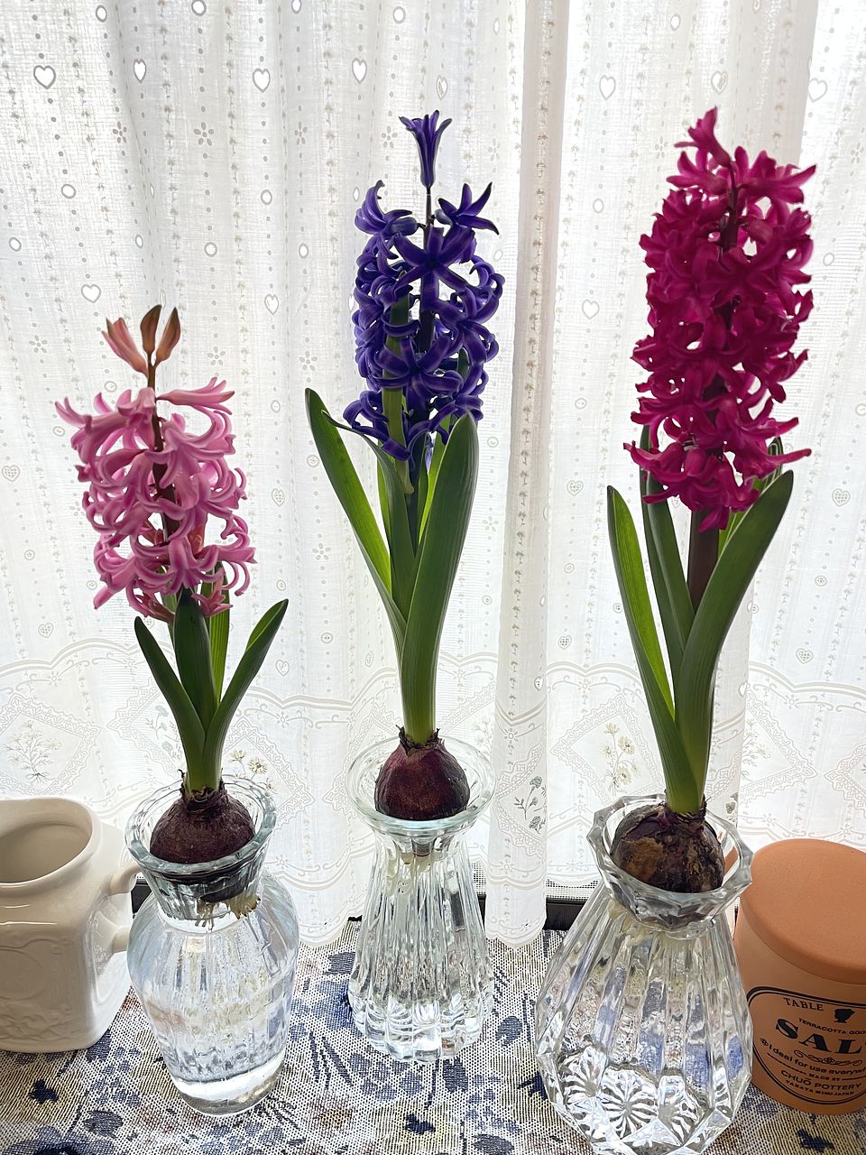 球根用のベースがないので、ガラスの空き瓶に入れてますが問題ありません^ ^3つが順番に開花してきて、次は何色かな〜とか長めに楽しめるのもいいです☺️
