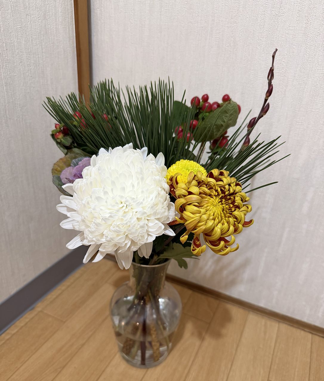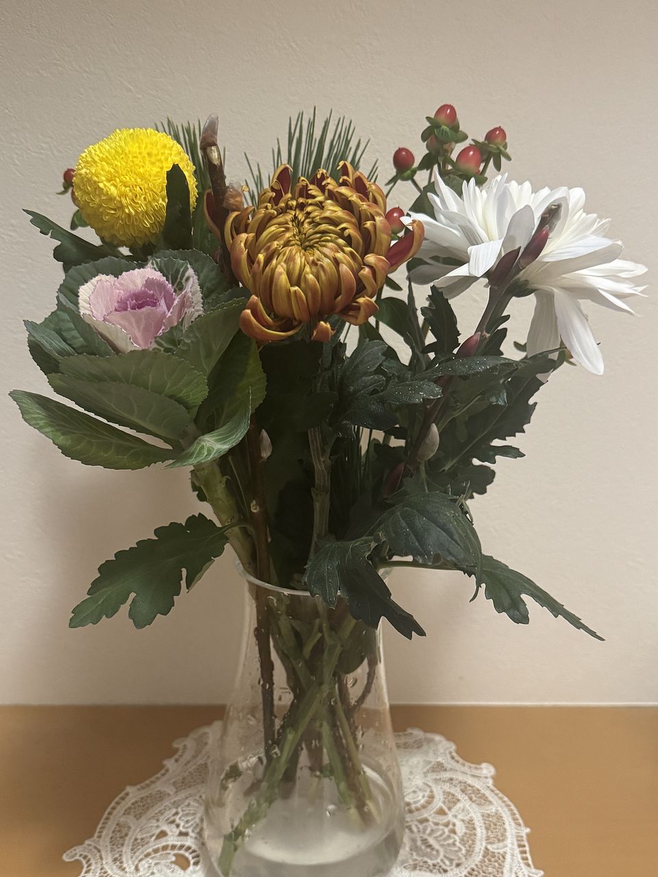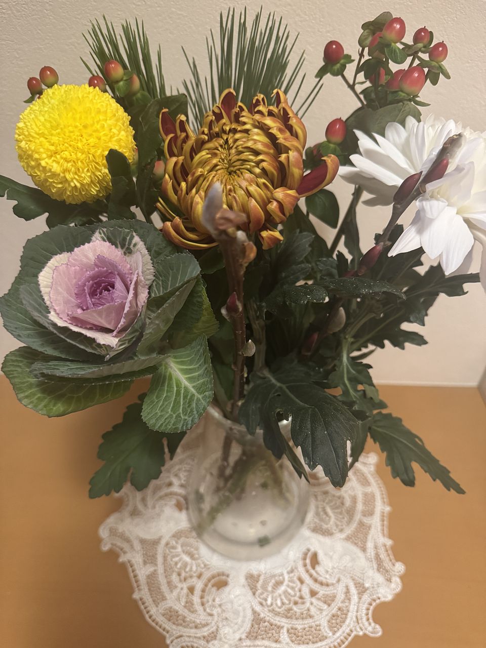 ボリュームがあって華やか。 お正月にぴったりです。 特に白いマムが大きくて存在感がありました。 長持ちしてくれると良いなと思います。