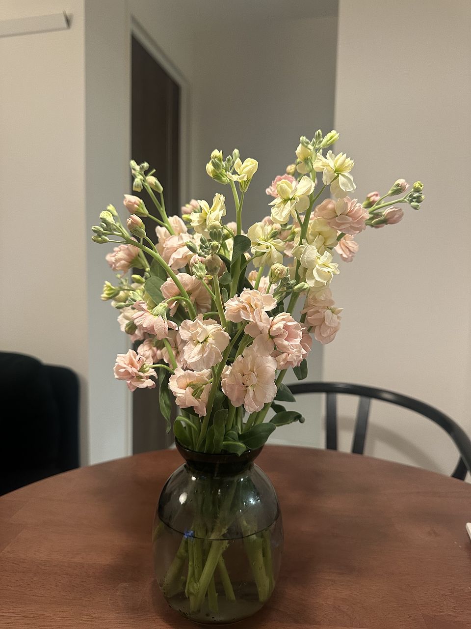 ボリューム、優しい色合い、香りの三拍子揃って大満足です😍 5本だけなのにすごいボリュームで一つの花瓶に入りきらなかったので、3本はまとめて、残り2本は家に生けてあった終わりそうなお花に追加投入してみました🤣 それぞれいい感じになりました🥰