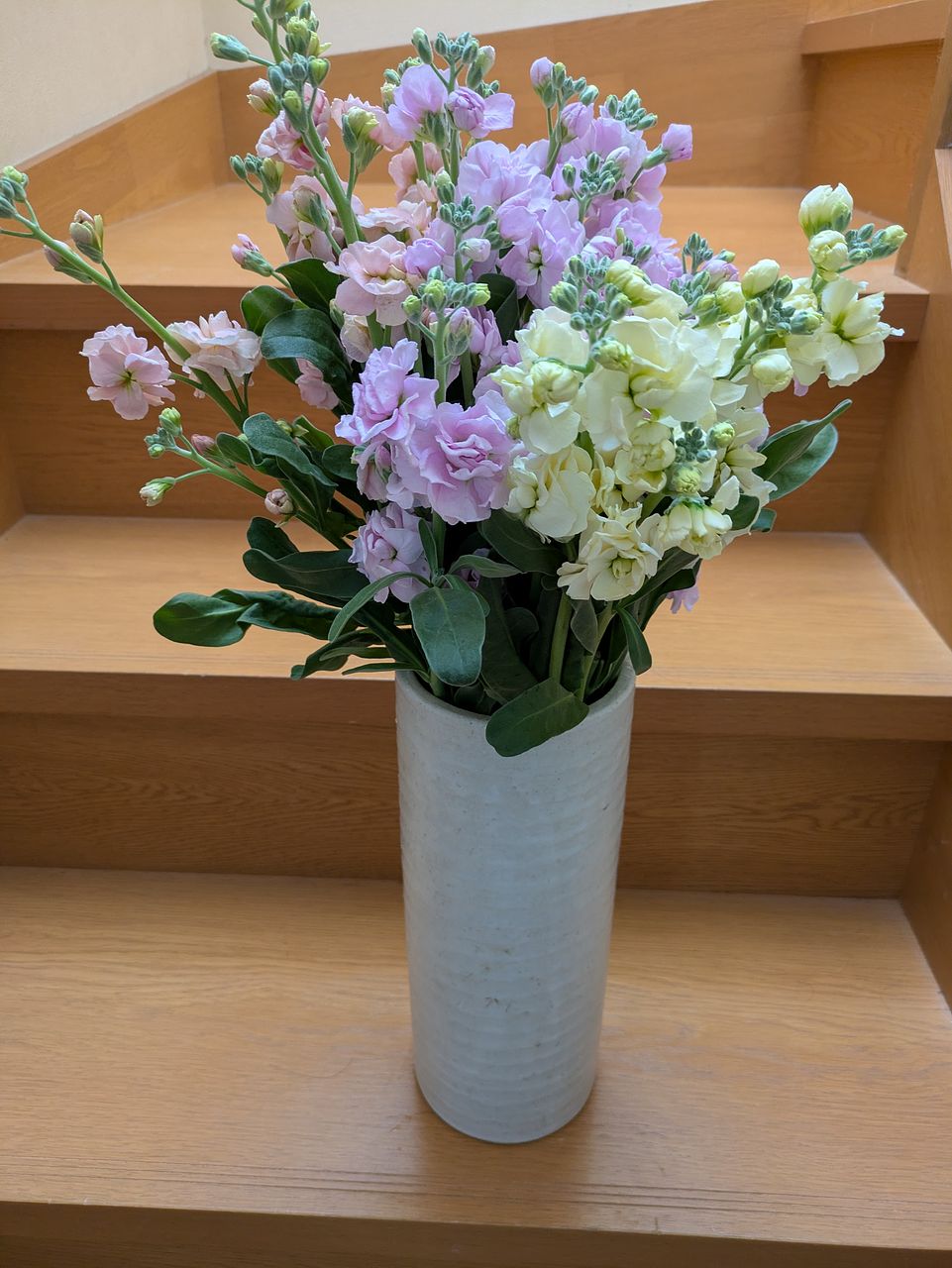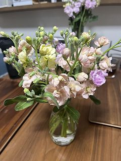 パステルカラーで良かったが丈が短いのが残念。 枝分かれ(スプレー状)してる部分下出カットされてるので花瓶に生けにくい。 クリーム色のストックの先端2本が折れてました。 気温が低いので長持ちすると思うので、十分楽しめそうです