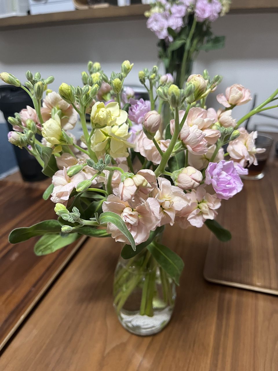すごく元気でボリュームたっぷり。箱を開けるといい香りがしました。大きな花瓶がなかったので2つに分けて飾リました。ひとつはストックメインで。もうひとつは前回オーダーしたフリージアと一緒に。家の中はもう春です!
