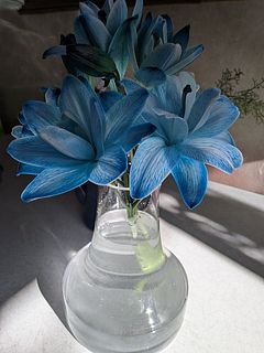 鮮やかなブルーに染まった百合。八重咲きの品種なので、花粉はほとんどありません。花びらはとても繊細で、傷がつきやすいです。気になる場合は、優しく取り除いてください。