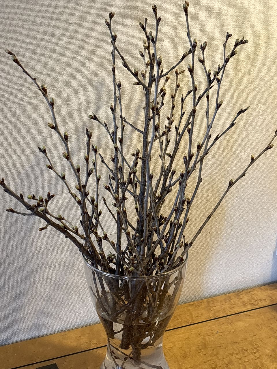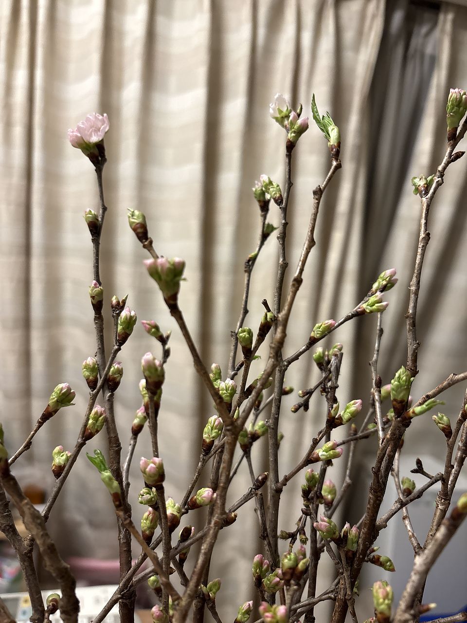 まだ葉も出てないし、枝に蕾ばかりですが,たくさんのお花が咲いてくれますように💕 思ったより短かったので、下の方の枝は取り除いて小さな花瓶にまとめて入れてみました 届いて4日目、だんだんとピンクが見えてきました(^^)