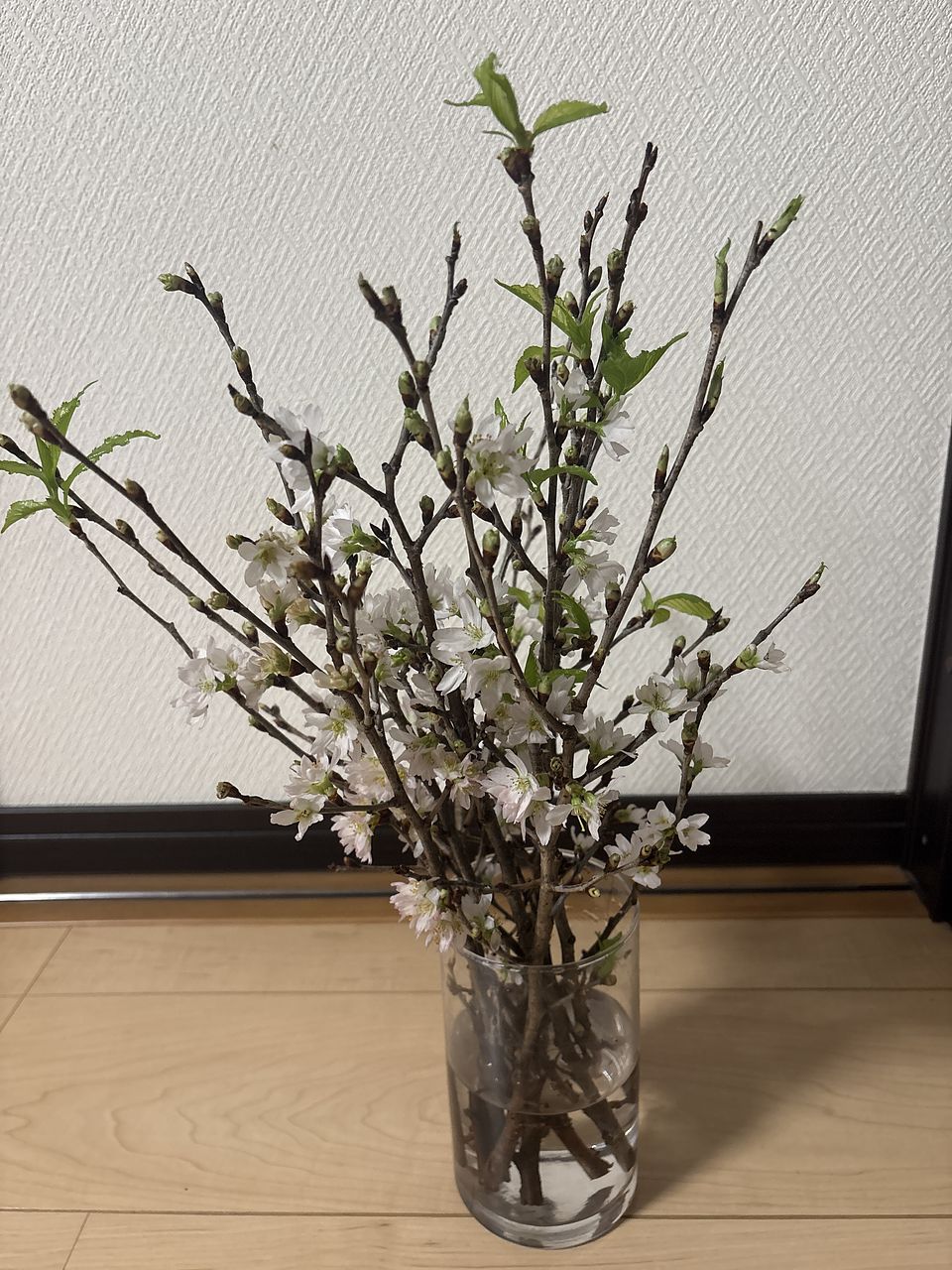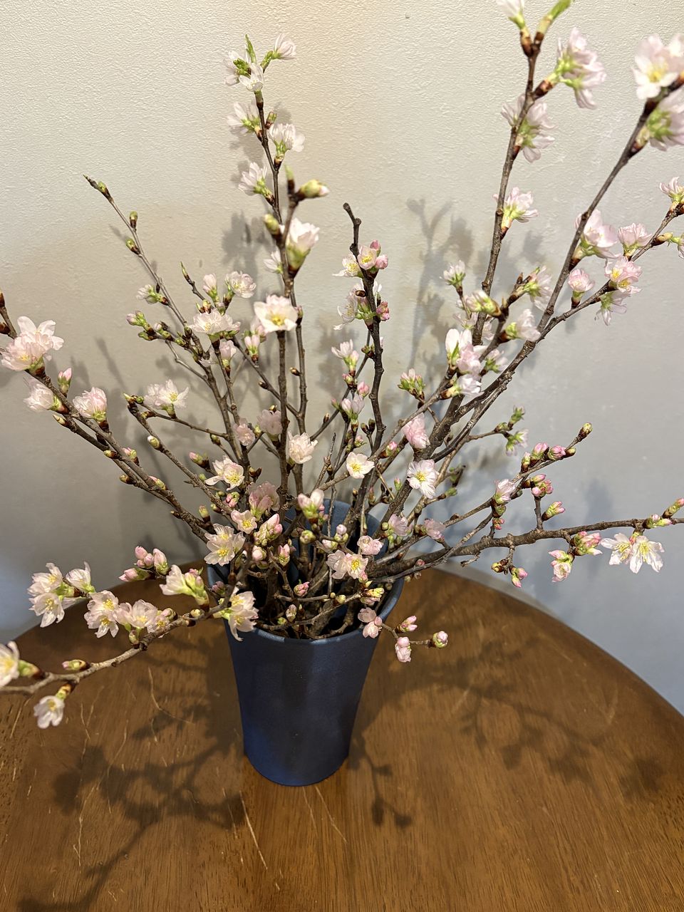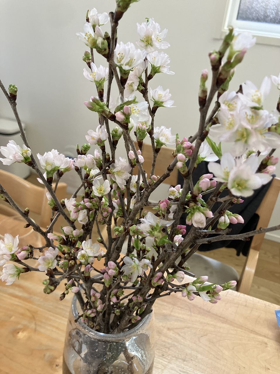 注文した花瓶と一緒に飾って、絵になりました。 ただ枝が思っていたよりもやや短めで下の方にもたくさん枝や蕾があり、落としてしまうのがもったいなかったです。 小枝を集めて小さなカップにとりあえず入れました。 さてどうしたものか?楽しい悩みです。