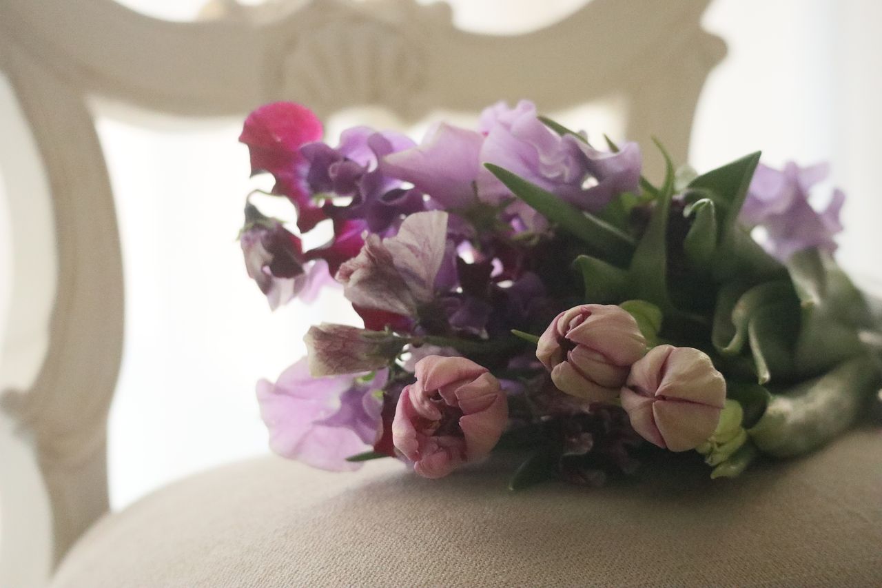 淡い紫を中心に丸みのあるチューリップとふんわり軽やかなスイートピー。