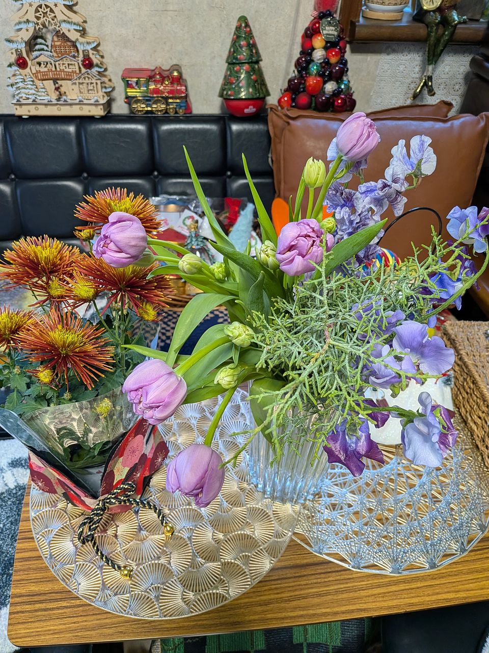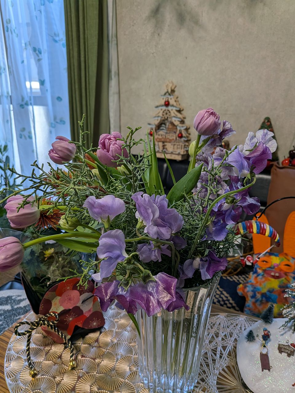 私の好きな色の淡いパープルのチューリップとスイトピーが届きました♪ とても上品で素敵です。 これからが冬本番ですが、春が感じられます(^ ^)