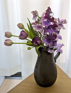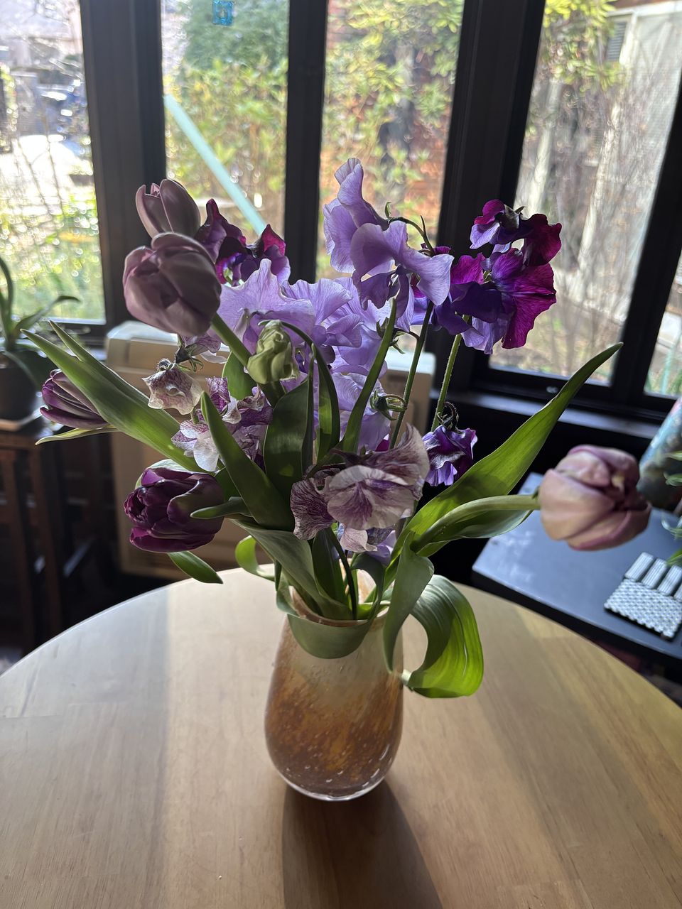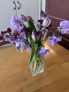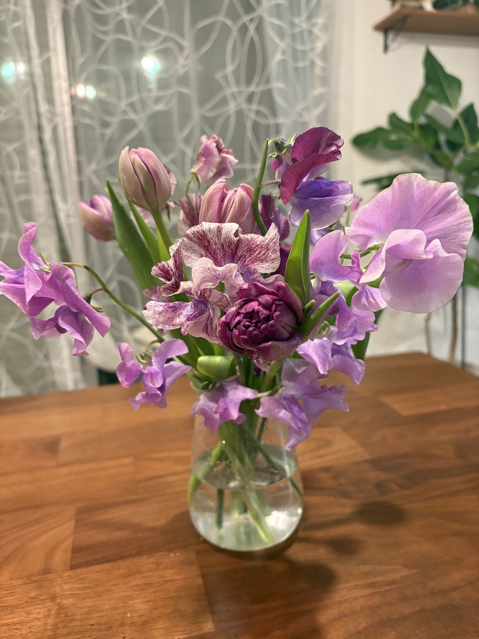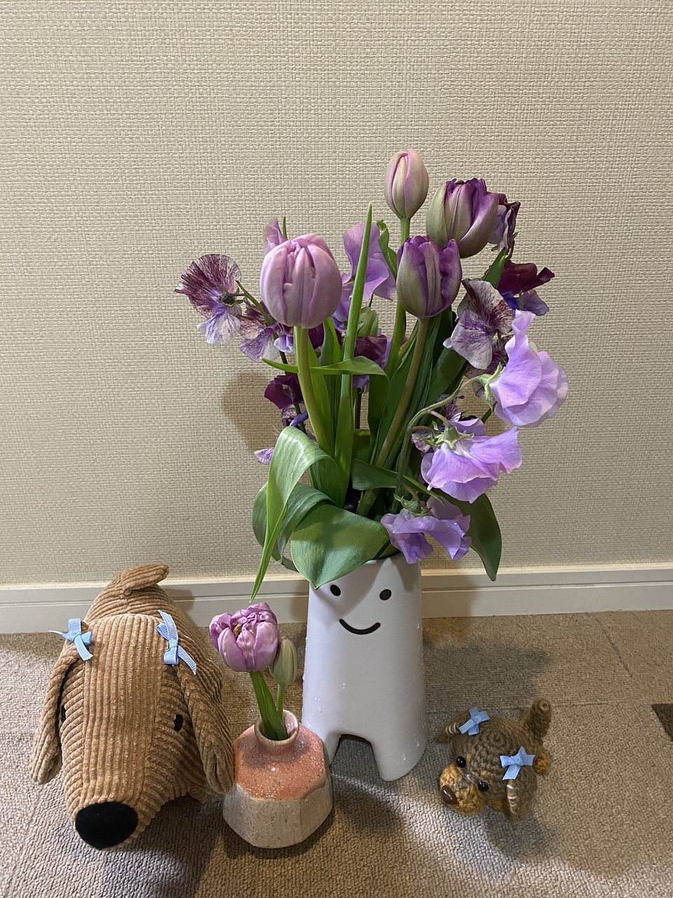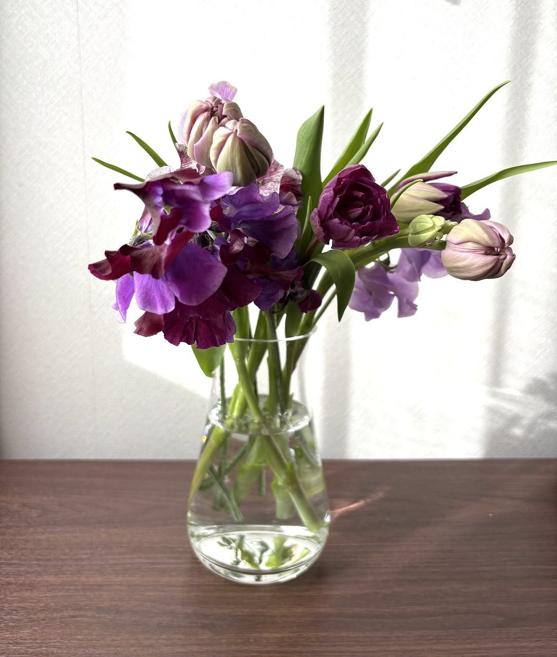 ステキな花束が届きました。 チューリップ5本、スイートピー6本、それぞれ2本づつ紫色の濃淡があり、花瓶に生けると色味の深さとボリュームを感じます。 直ぐにもリピートしたいくらいステキです❤️