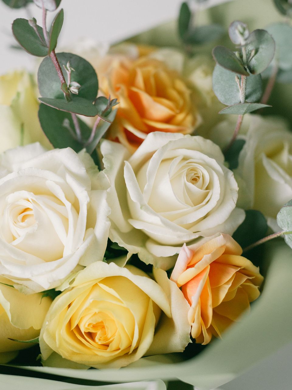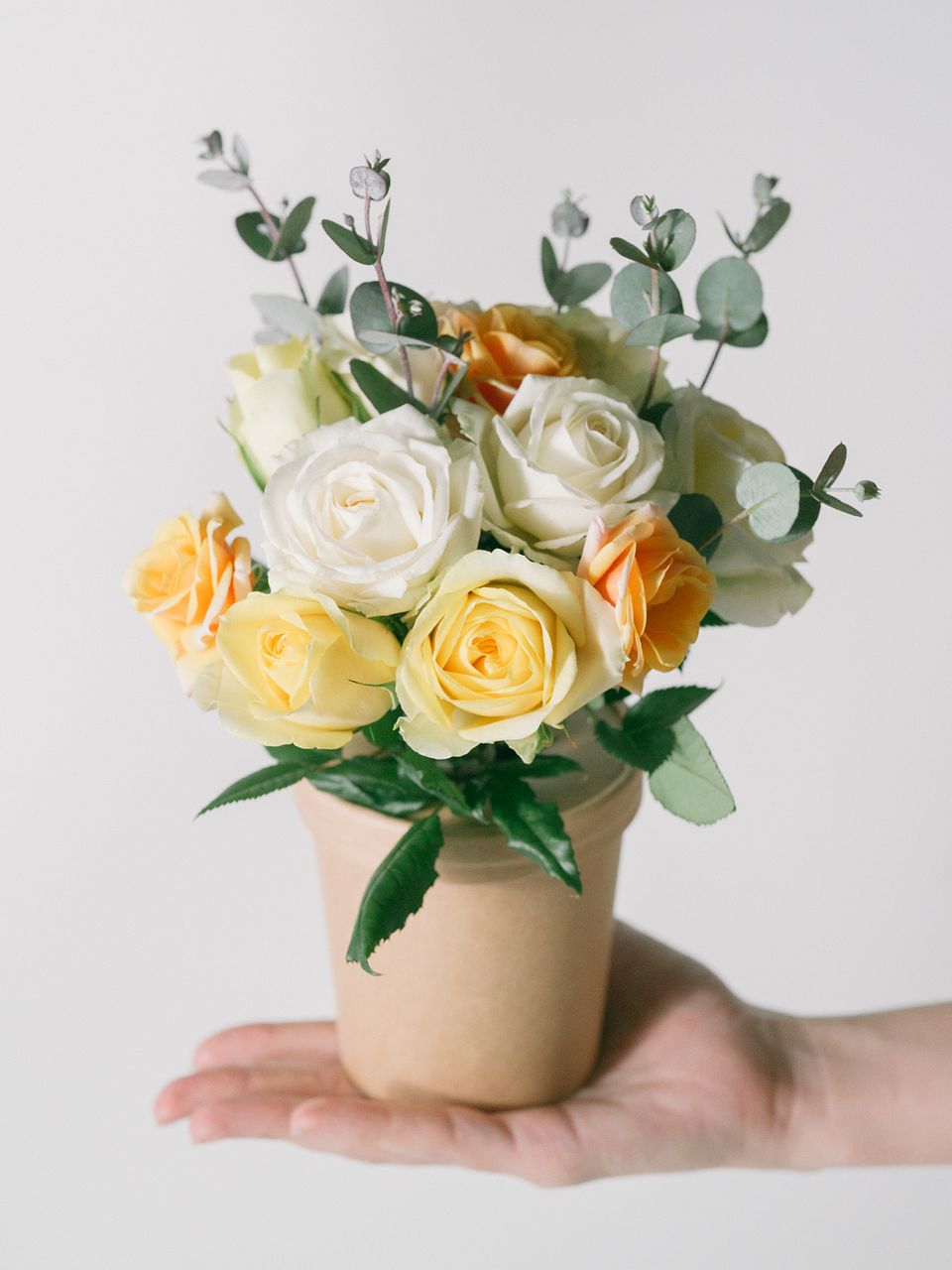 通常の切りバラよりも茎が短く、小輪から大輪まで色とりどりのバラを軽やかに楽しめるスタイルです。