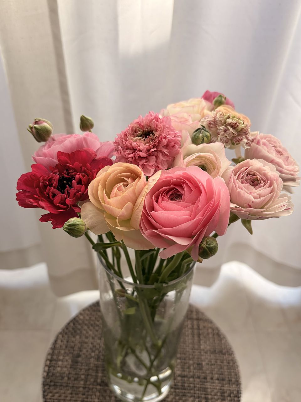 とにかくかわいい!いろんなピンク、いろんなカタチのラナンキュラスがたっぷり入っていて、いくらみていても飽きない感じでした! 保ちはそれぞれでしたが、最後の一本まで楽しめました!