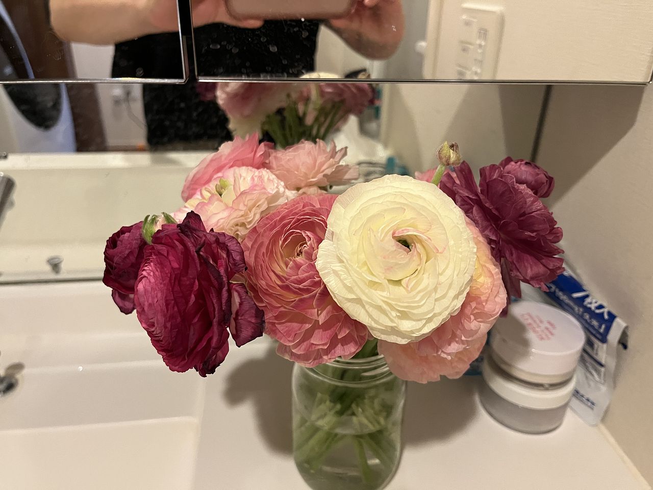 ほぼ完全に咲いてるものが2輪、八重咲きのものが多く蕾もあり、バランスが良かったです。グラデーションもとても綺麗でした。