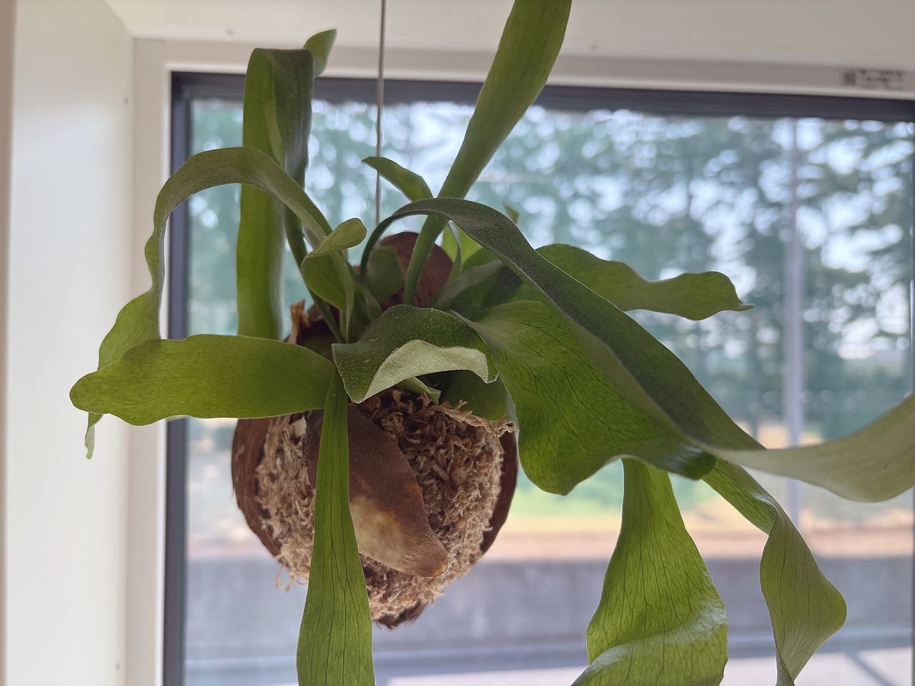 まるっとしたヤシの実にくっ付いているビカクシダ。とってもかわいいです。吊り下げる用のワイヤーも付いていて、いい感じ。