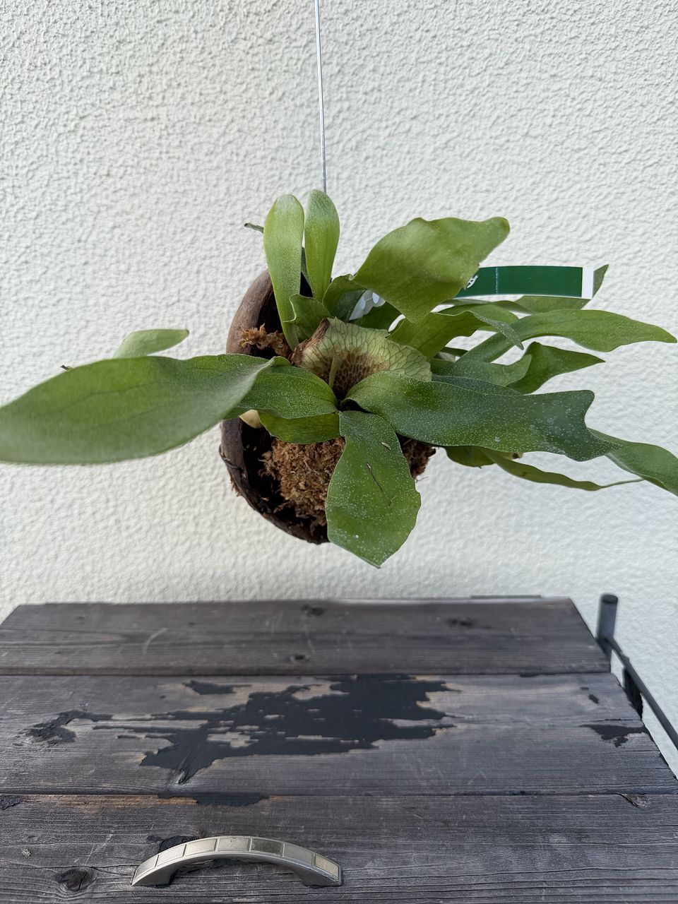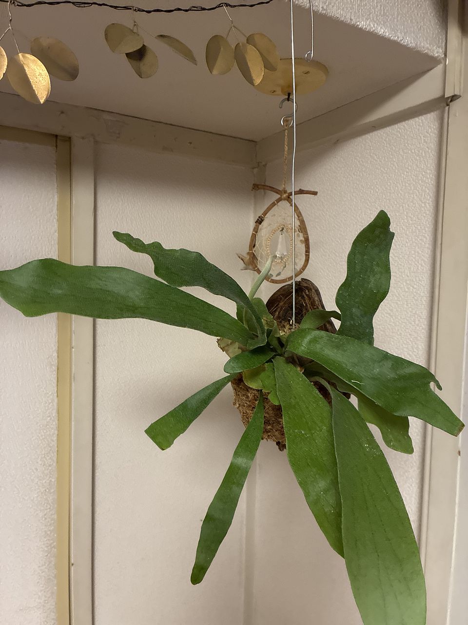 ヒガクシダは大きいイメージで手が出しづらかったのですが、小さくて可愛いです。器になってるココナッツはご飯茶碗くらい。シダが植っている水苔(?)も思ったより全然しっかりしていて届いた時もポロポロしてませんでした。引っ掛ける針金も付いてるのですぐに飾れます✨