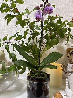 今回はお花の色は選べないとの事でしたが、ラッキーな事に私の好きな色のミディファレノが届きました😍 写真でもわかる様に蕾もついていて、咲いてくれるのを楽しみにしています!後ろ姿も愛らしいです。アクアポットは始めてですが、クリアーなので中の様子がわかります。お部屋がグッと明るくなりました!
