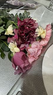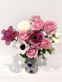 とっても素敵な組み合わせのブーケで嬉しかったです!お花を触らずに気をつけて箱から出したのですが、ミニバラが一輪折れてしまっていて可哀想でした…小さいグラスに入れて飾ってます。箱に入れる時に折れたのかな…?