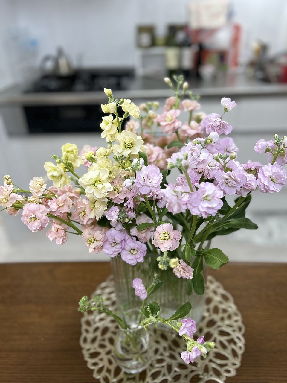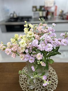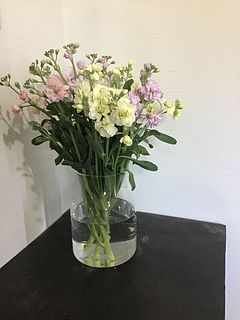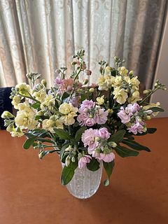 パステルカラーで良かったが丈が短いのが残念。 枝分かれ(スプレー状)してる部分下出カットされてるので花瓶に生けにくい。 クリーム色のストックの先端2本が折れてました。 気温が低いので長持ちすると思うので、十分楽しめそうです