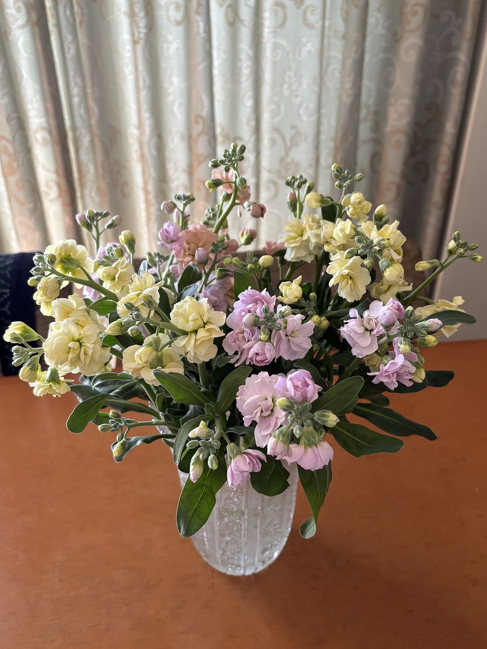 箱を開けたらたくさんの可愛らしいストックのいい香りがしました。淡い色合いが春らしくきれいです。 名前もいいですね。 ストックはお手入れしながら長持ちしますよ。楽しみです。