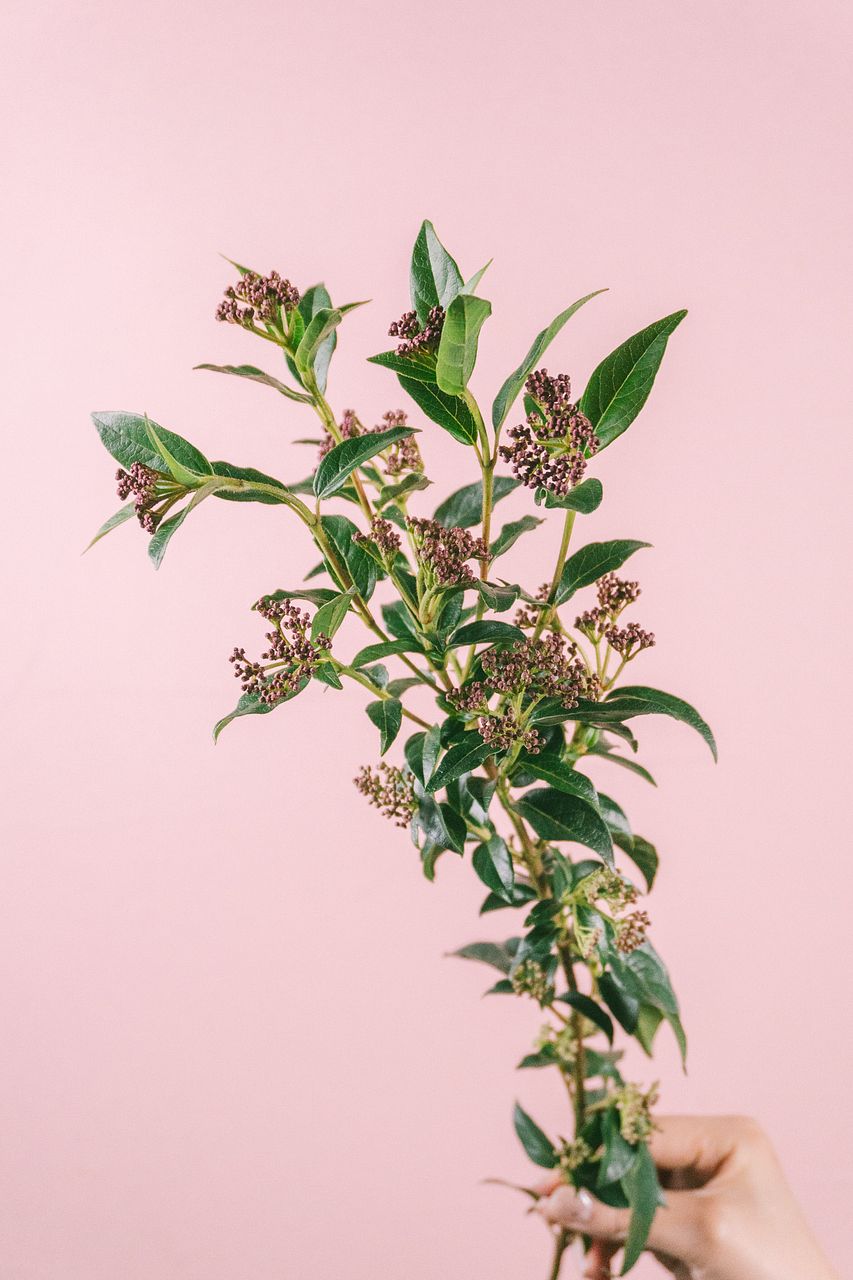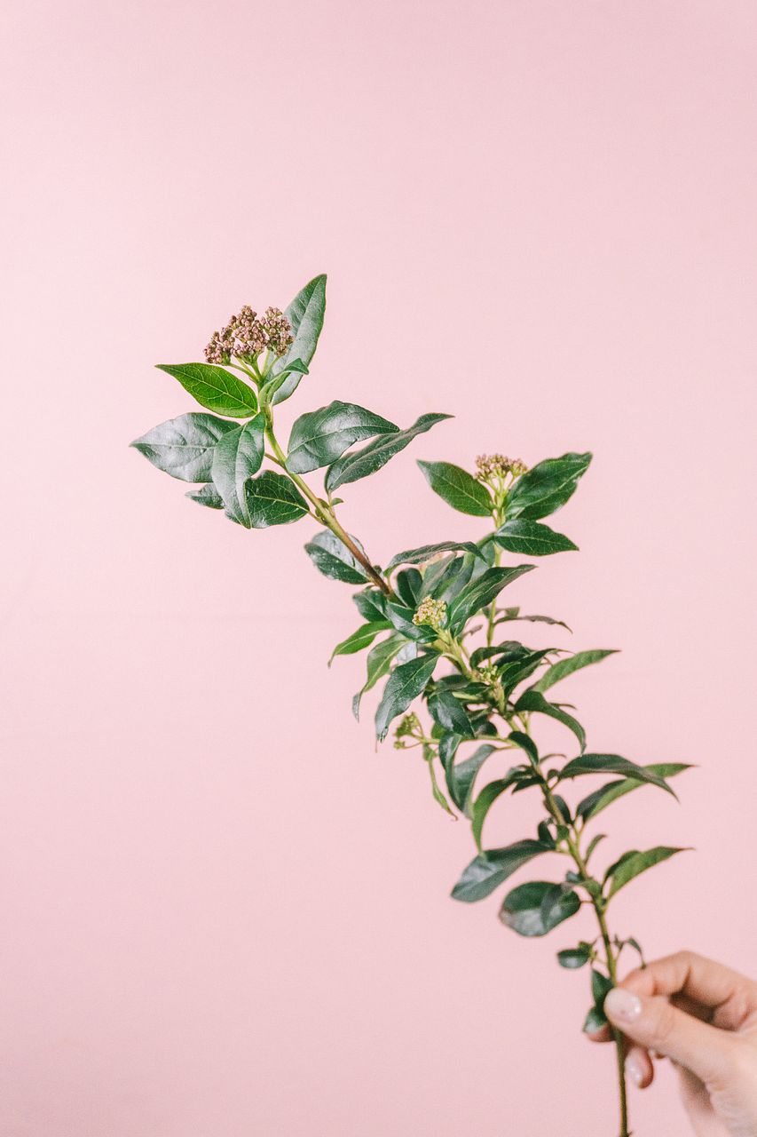 艶のあるドラセナの葉がつくるシックな表情に、ビバーナムの小さな蕾がさりげない抜け感を添え、甘さを抑えた大人の雰囲気に仕上げました。