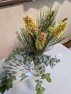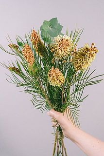 シャープな葉のラインと、深みのあるグリーンからアンティークトーンへ移ろう色合いが、空間に静かな存在感を添えます。ネイティブフラワーならではの野性味と洗練が共存し、甘さを抑えた大人のインテリアに自然と馴染む佇まいです。