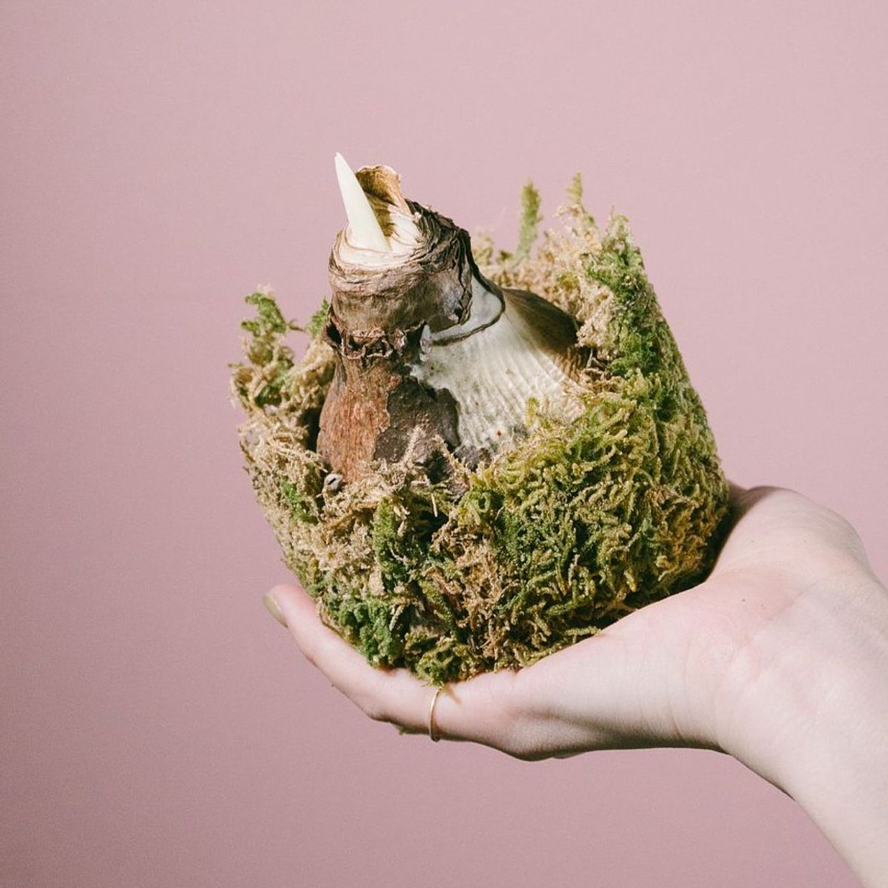 ぽってり姿がかわいい。受け皿などなくてもOK。このまま置いても育ちます。付属の苔の上に置いても、お気に入りの受け皿などに置くのもおすすめ。