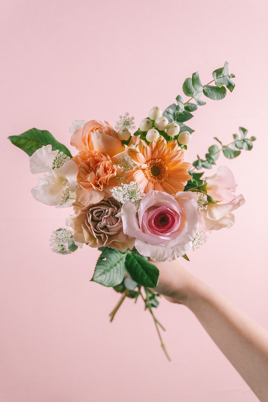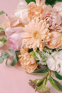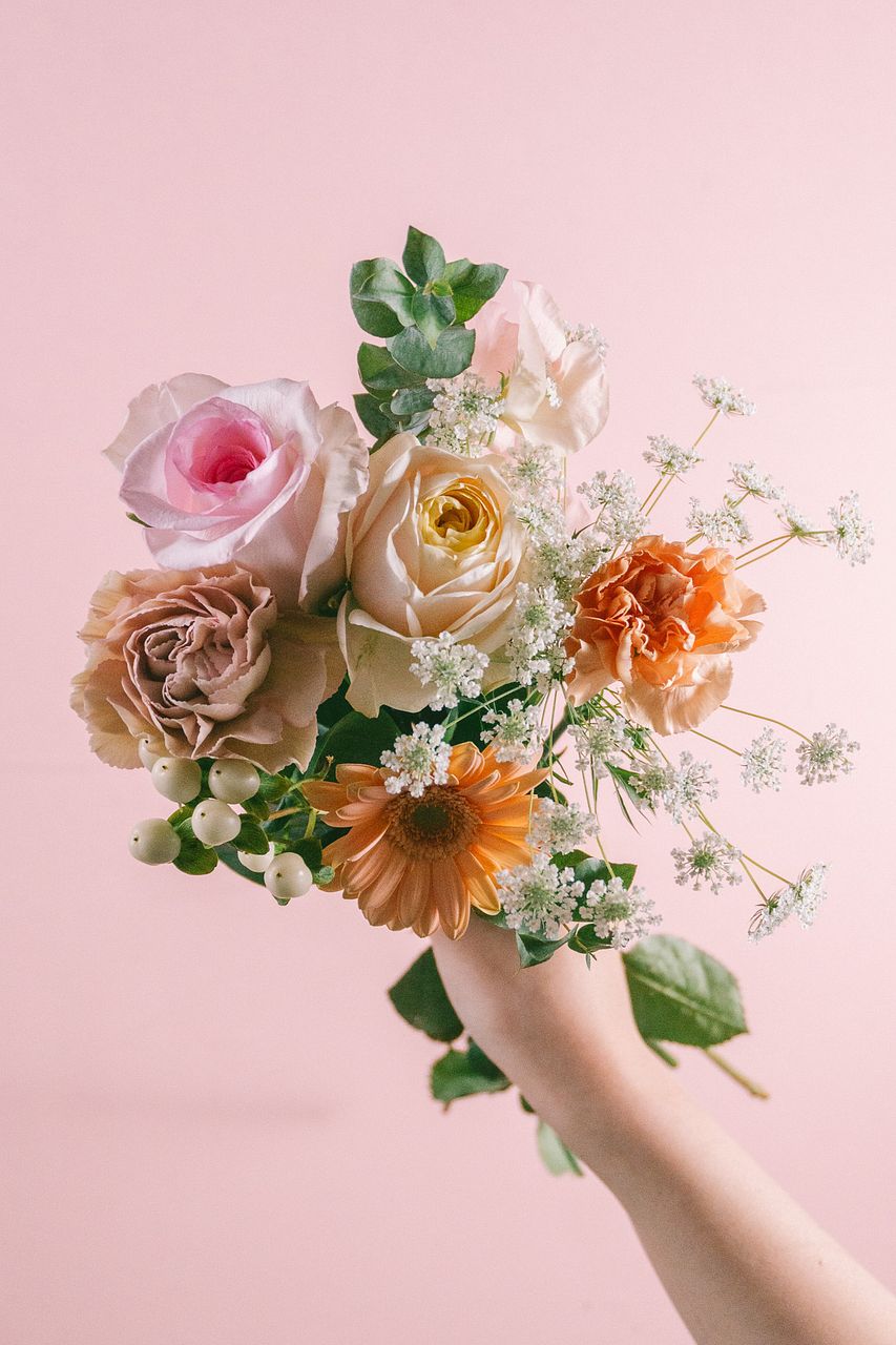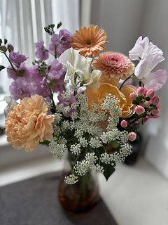 優しいピンクや淡いオレンジのお花をチョイスしてお届けします💐