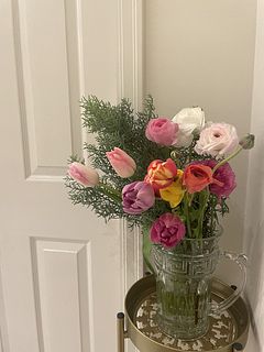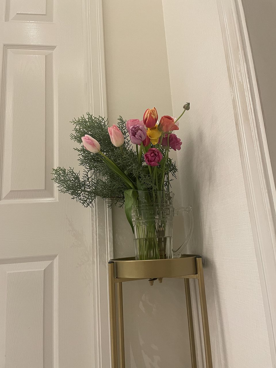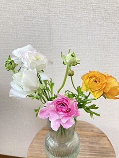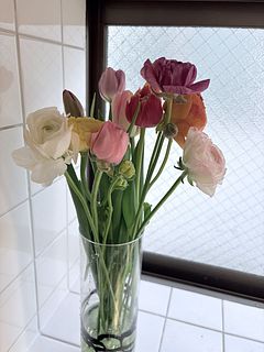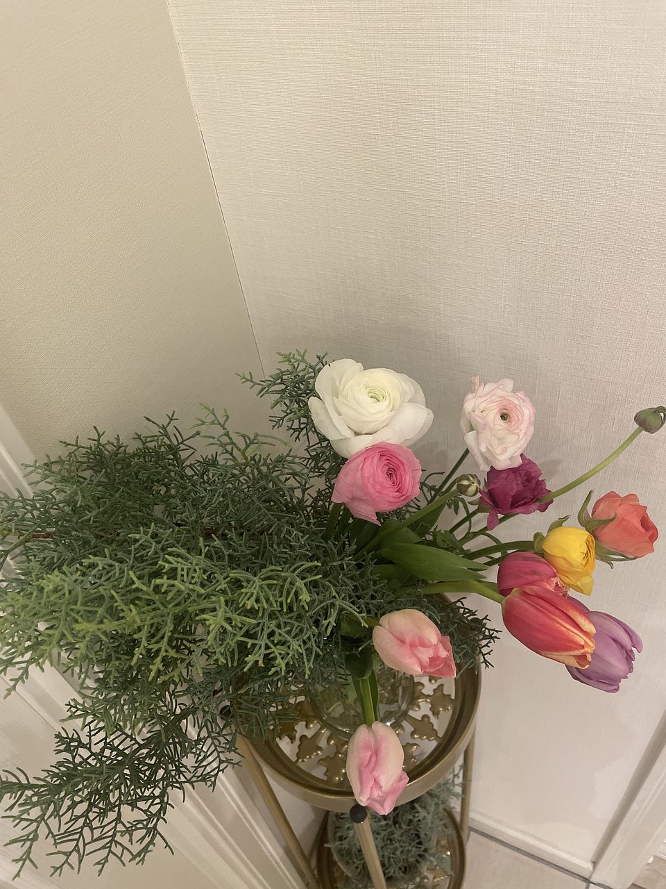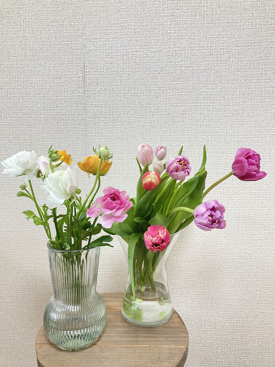 この時期、暖かいリビングですぐに終わってしまわないように玄関と洗面所に飾っています。 どちらも1日のスタートとゴールに時間を過ごす家の場所なので良く飾ります。気持ちがいいです。 今回はチューリップとラナンキュラス分けて飾りました。どちらも可愛らしい色合いでとても気に入っています。