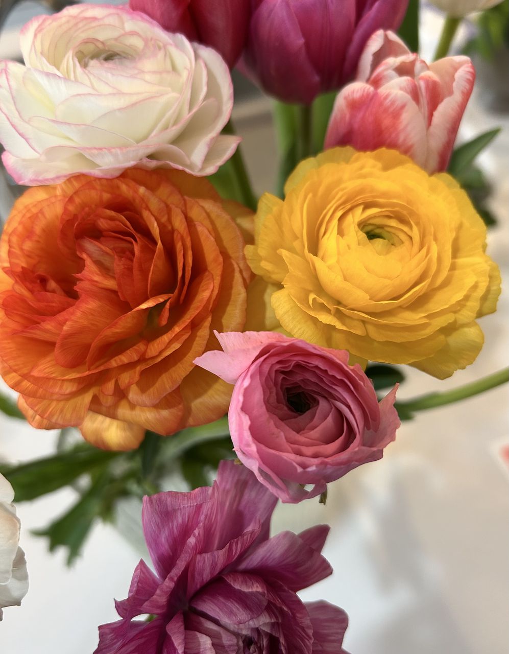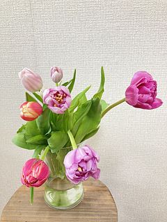 八重のチューリップやふわっとしたラナンキュラスの組み合わせが可愛い!色鮮やかで華やぎます☺️