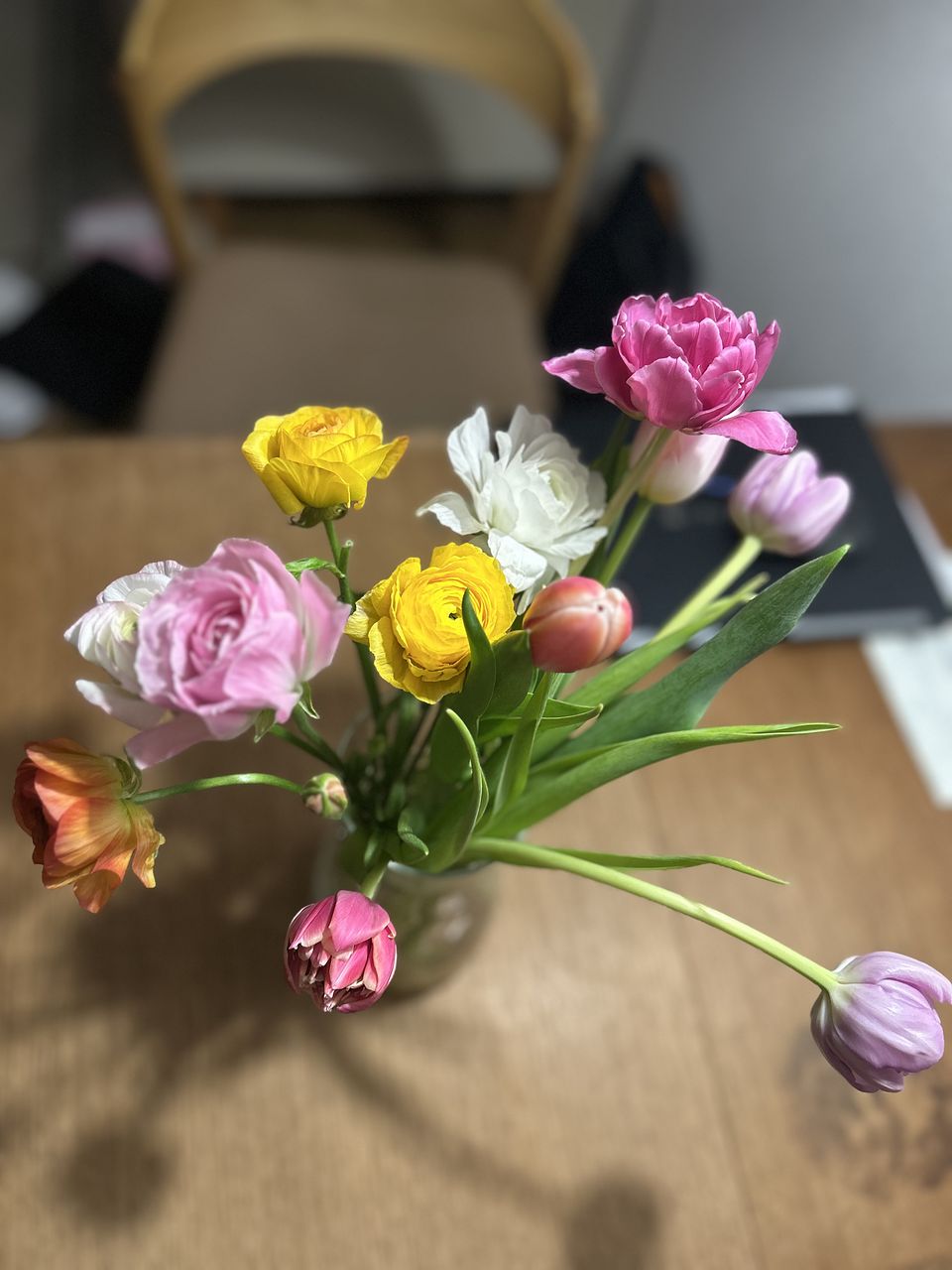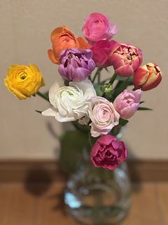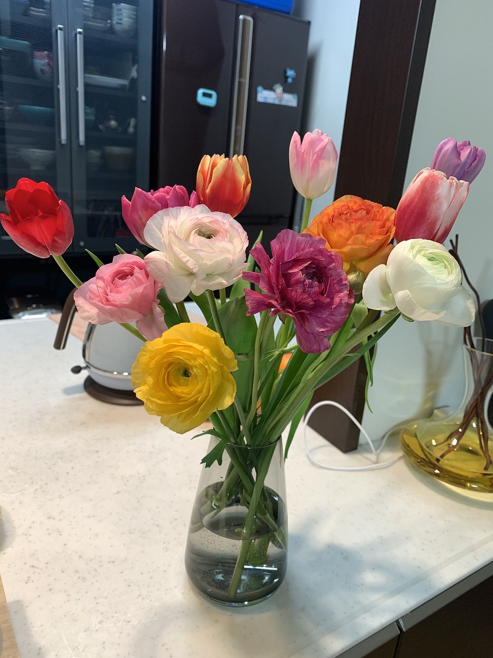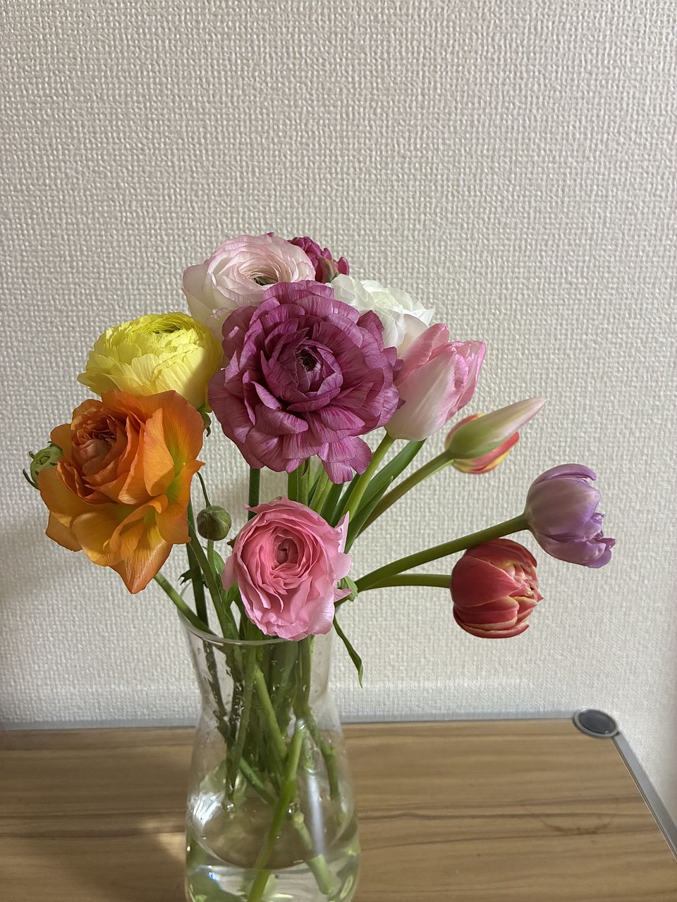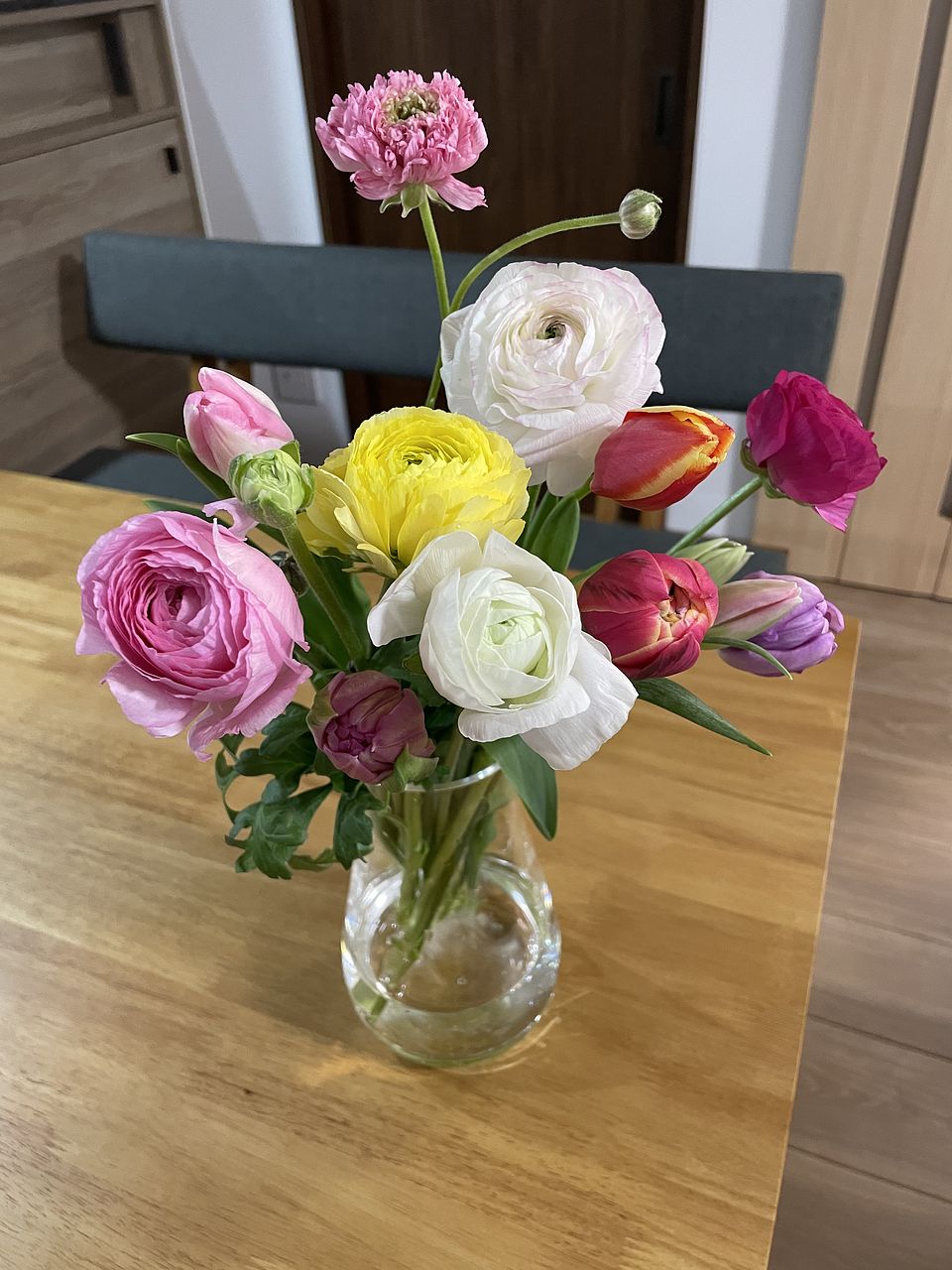 大好きなラナンキュラスが出るのを待ってました!チューリップも種類か混ざっていて可愛いです。カラフルな組み合わせで、見る度に明るい気持ちになります。