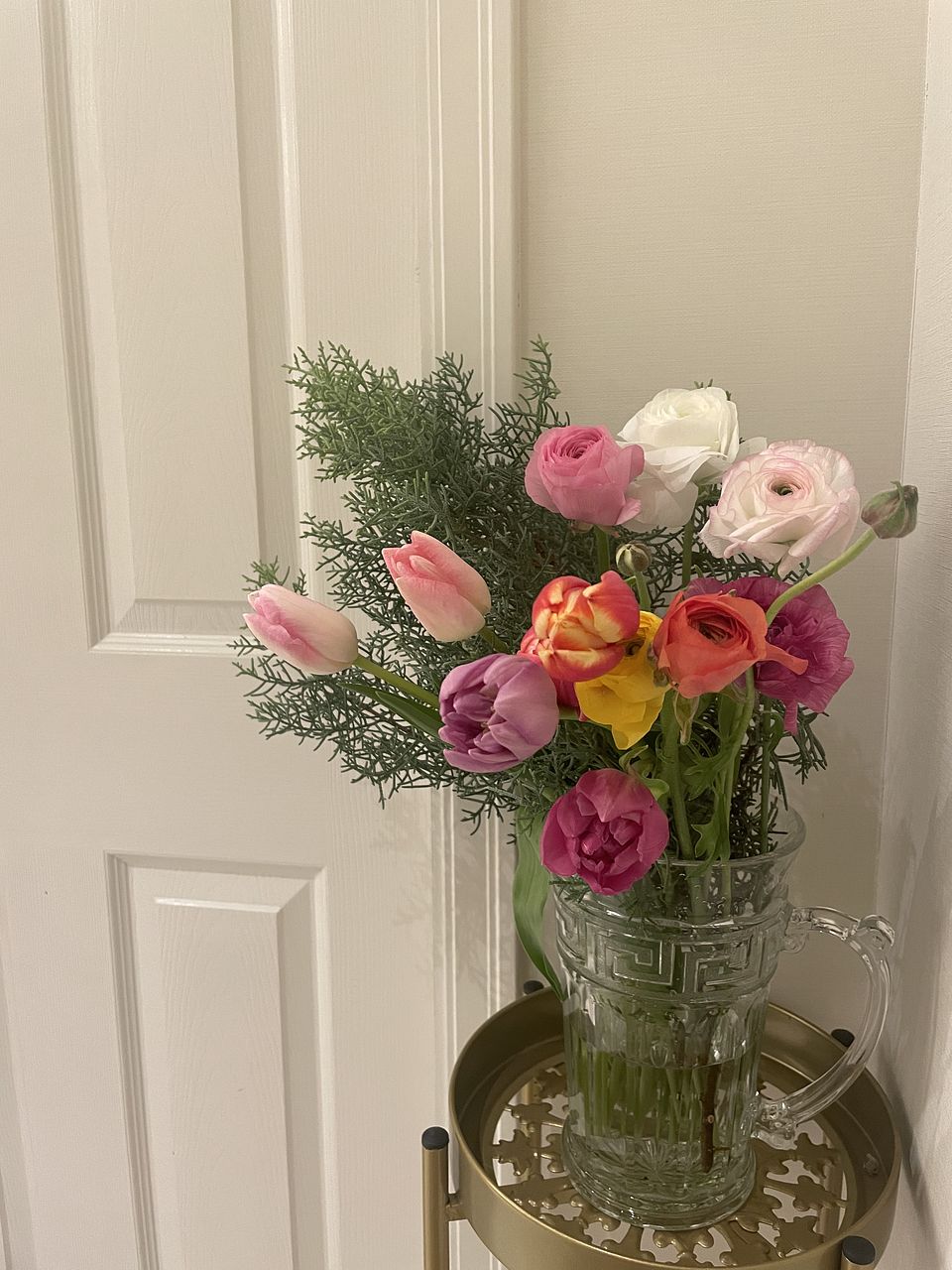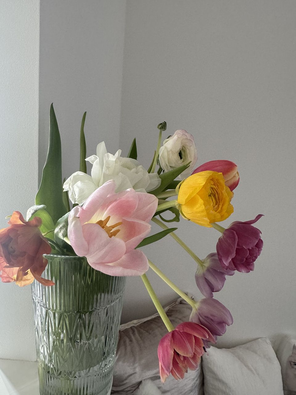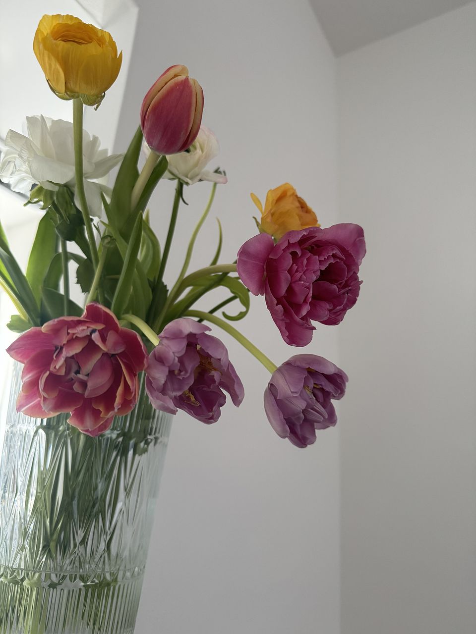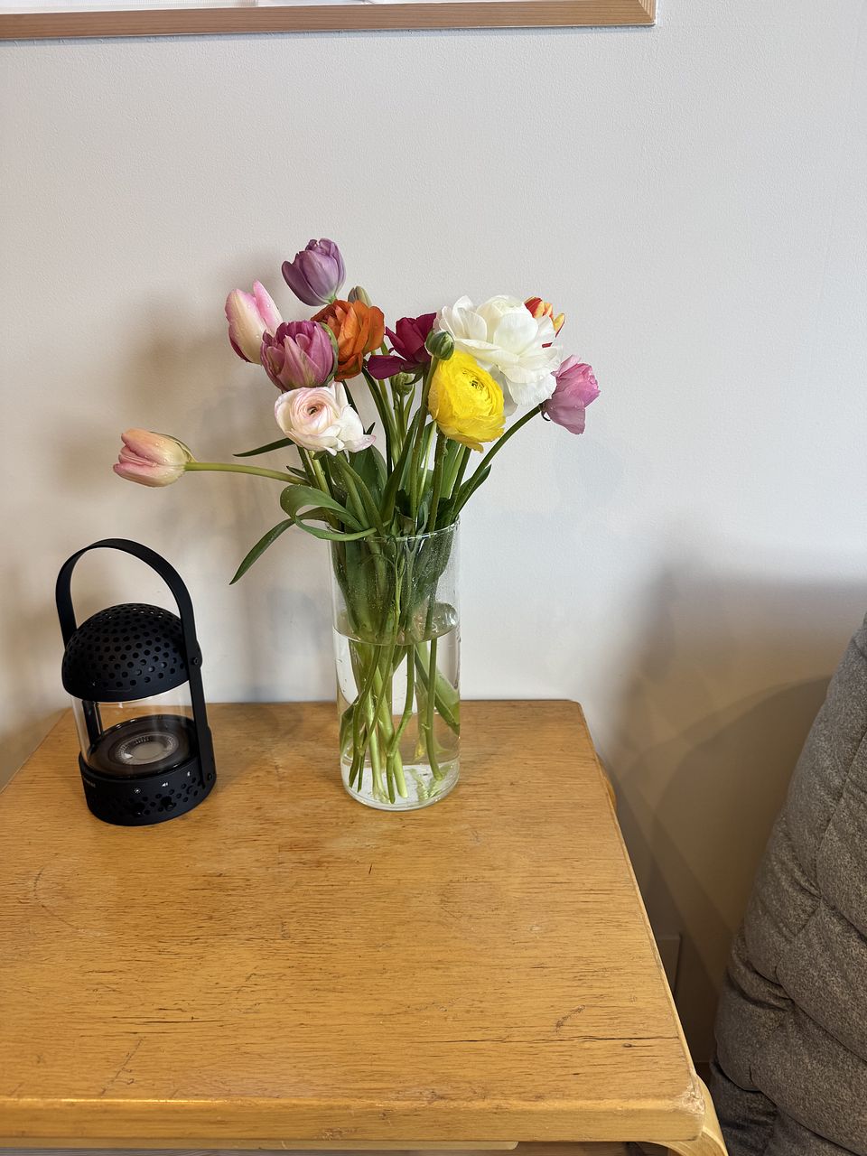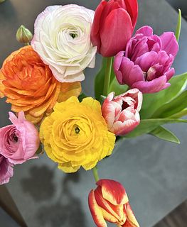 大好きなラナンキュラスが出るのを待ってました!チューリップも種類か混ざっていて可愛いです。カラフルな組み合わせで、見る度に明るい気持ちになります。