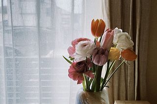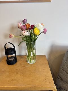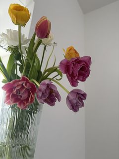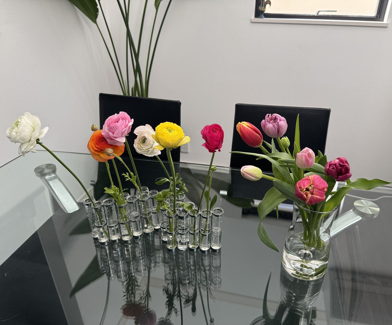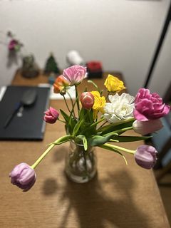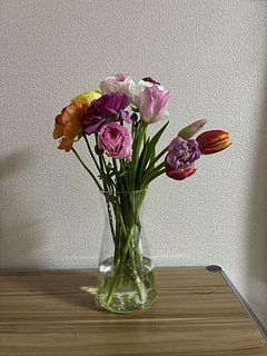 チューリップ6本、ラナンキュラス6本。 花自体は小ぶりですが花びらに傷もなく色鮮やか。 シンプルな曇りガラスの花瓶に挿しただけでサマになります。