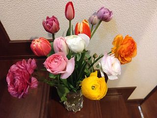 とっても可愛いらしいチューリップとラナンキュラスが届きました。 一気に家の中が明るくなりました。